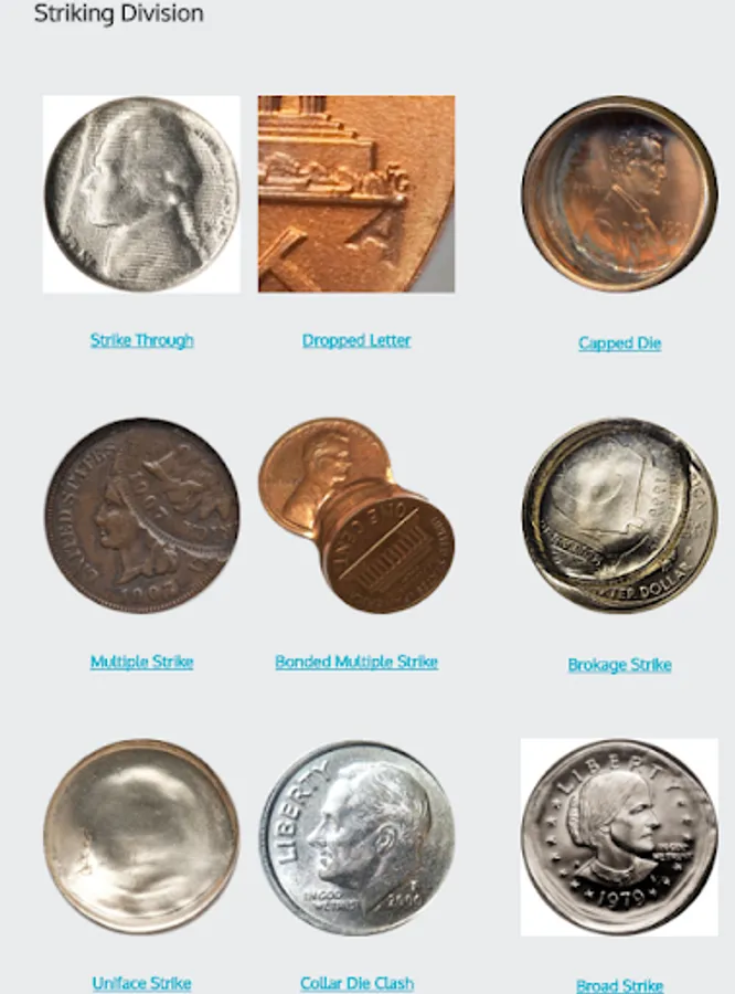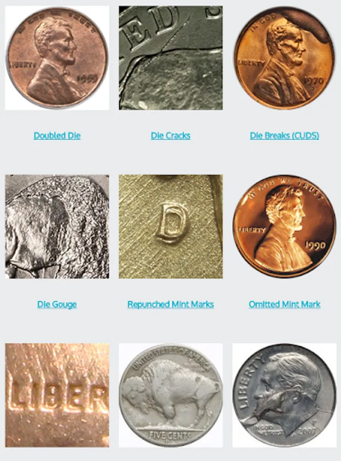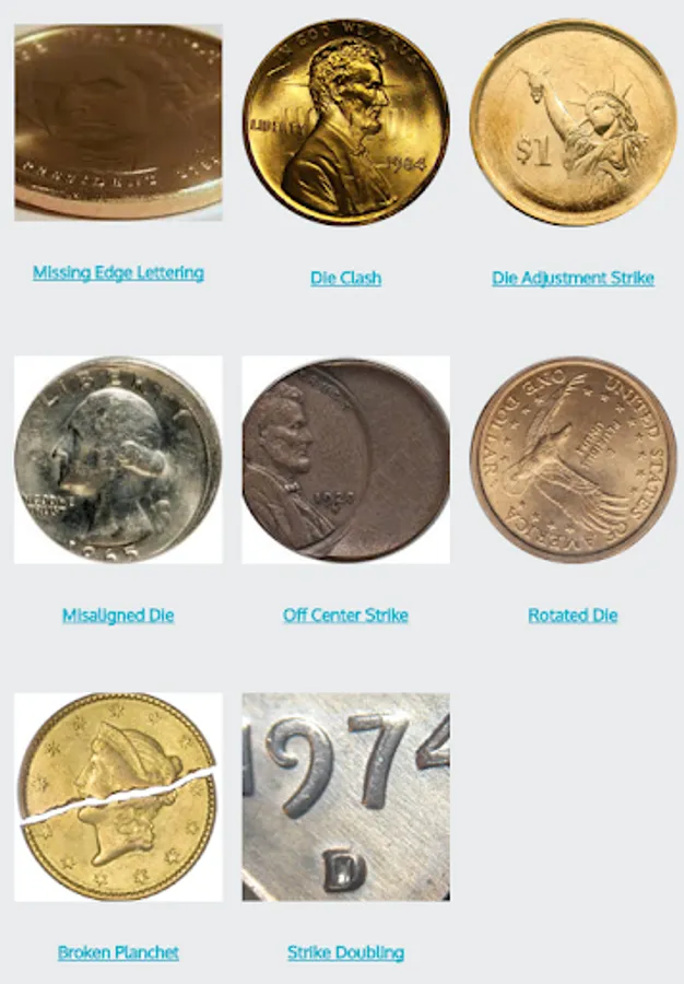 See images and values for doubled dies, CUDS, bonded and multiple strikes, capped dies, strike through errors, broken planchets, die cracks, die gouges, and all other major mint errors and varieties.