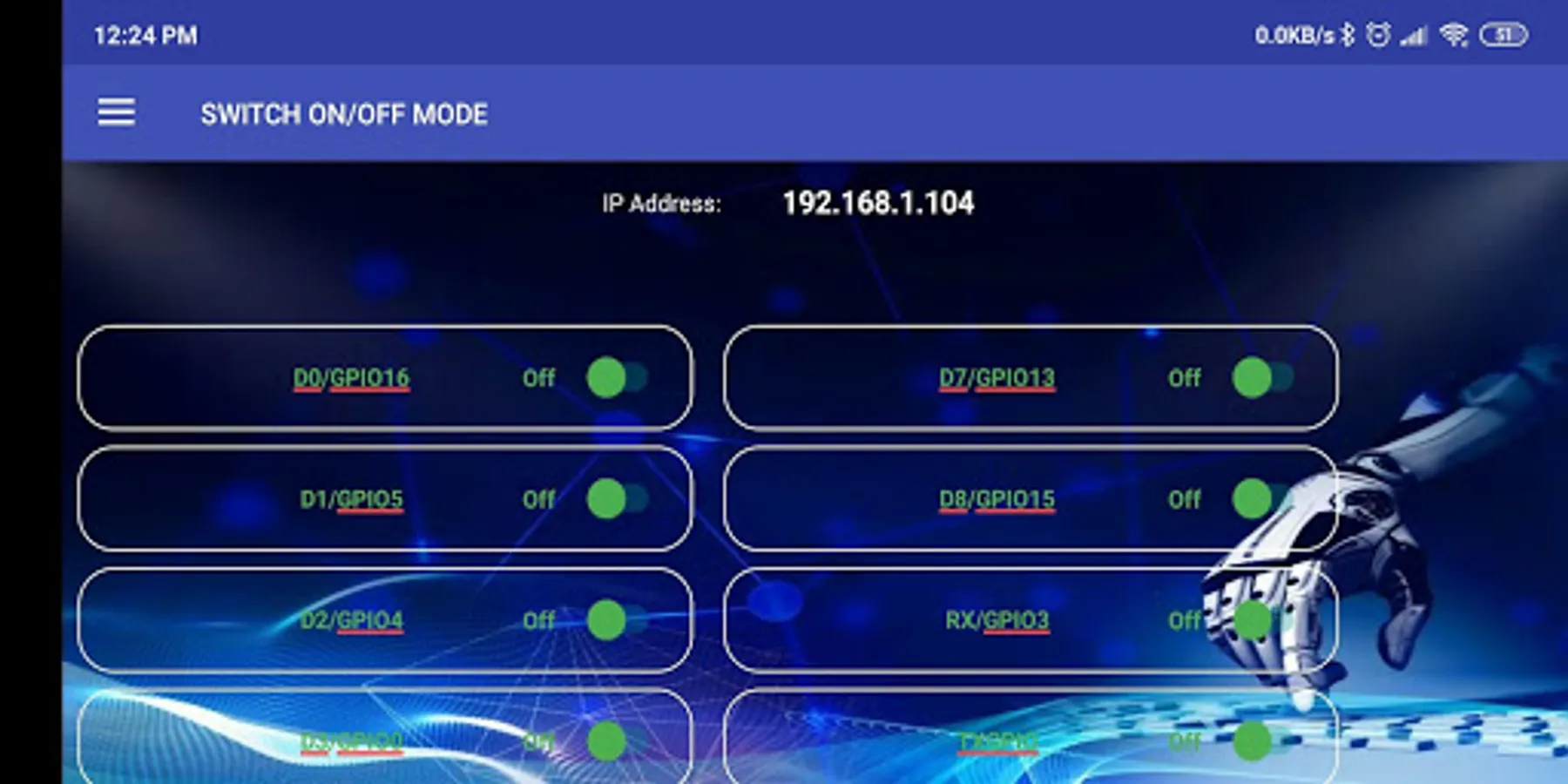 *SWITCH ON/OFF MODE: D0-D8,RX, TX, SD2, SD3 are all available (all 13 GPIO pins can be use)