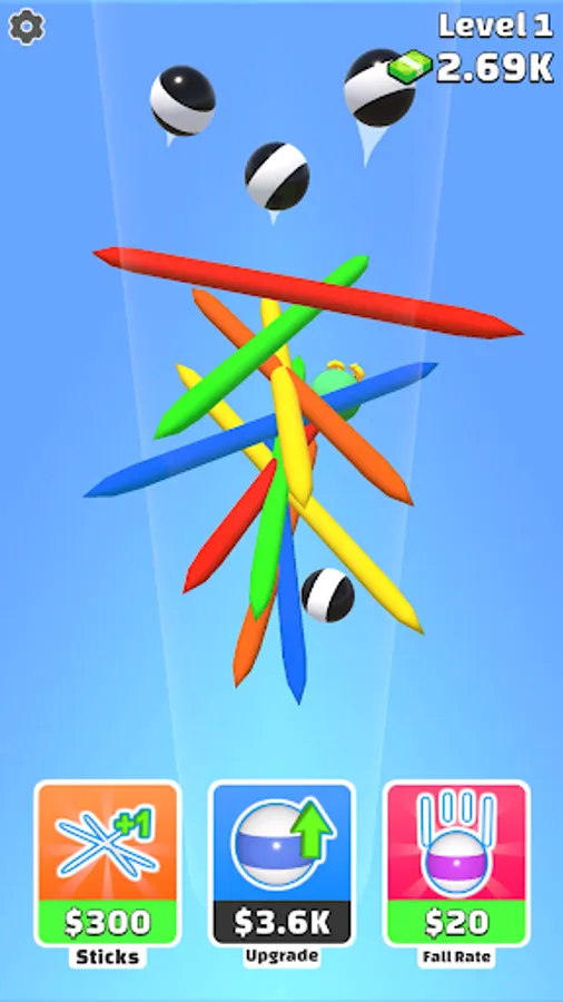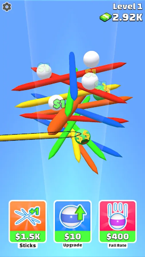 Insert the sticks and hold up the balls! Make more and more cash as the balls bounce!