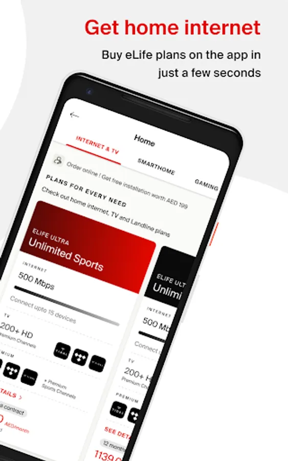 Connect to a world of entertainment and get free 24-hour installation when you shop our eLife plans. Get ultra-fast fiber internet with up to 1G speed, 300+ TV channels, unlimited local calling within UAE, premium gaming access, free subscription for Amazon Prime, STARZPLAY, Anghami & much more. Manage your bill payments, subscription activation, request eLife relocation or upgrade your eLife plans right here on the My Etisalat UAE app.