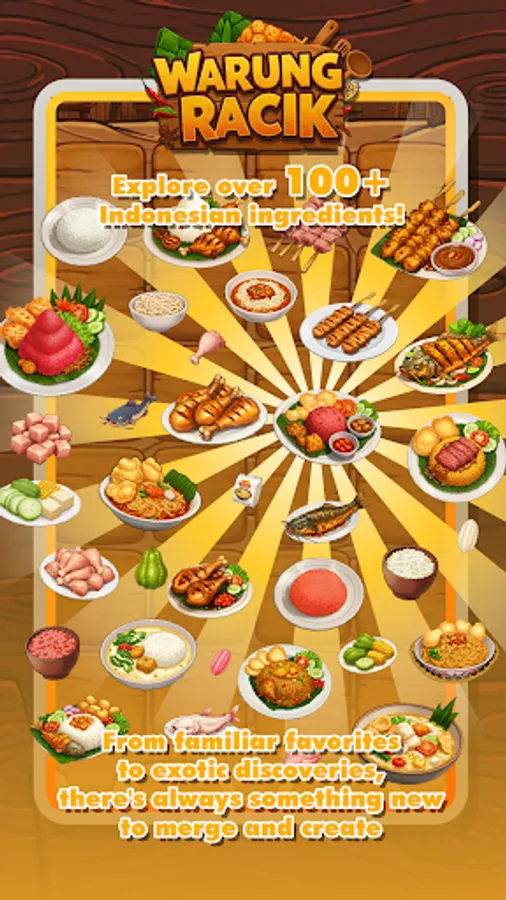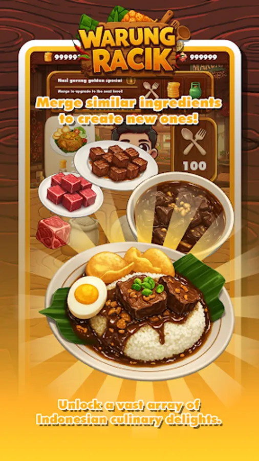 - Merge and Upgrade: Combine similar ingredients to create new ones! Unlock a vast array of Indonesian culinary delights, from Nasi Goreng to Rendang.