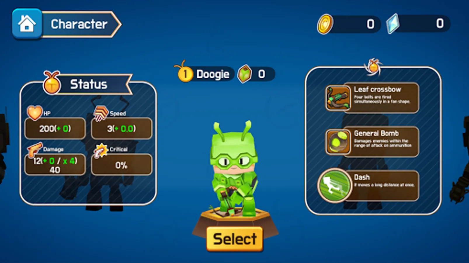 Choose one from various bugs characters and join the battle! Shake the lands of the battlefield as a battle master Baba or camouflage master Bency. Use the unique abilities of each bugs character to survive in Battle Bugs Arena.
