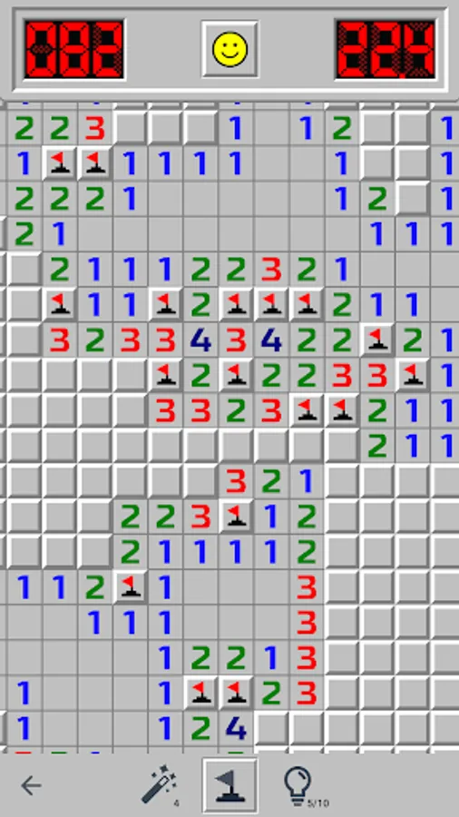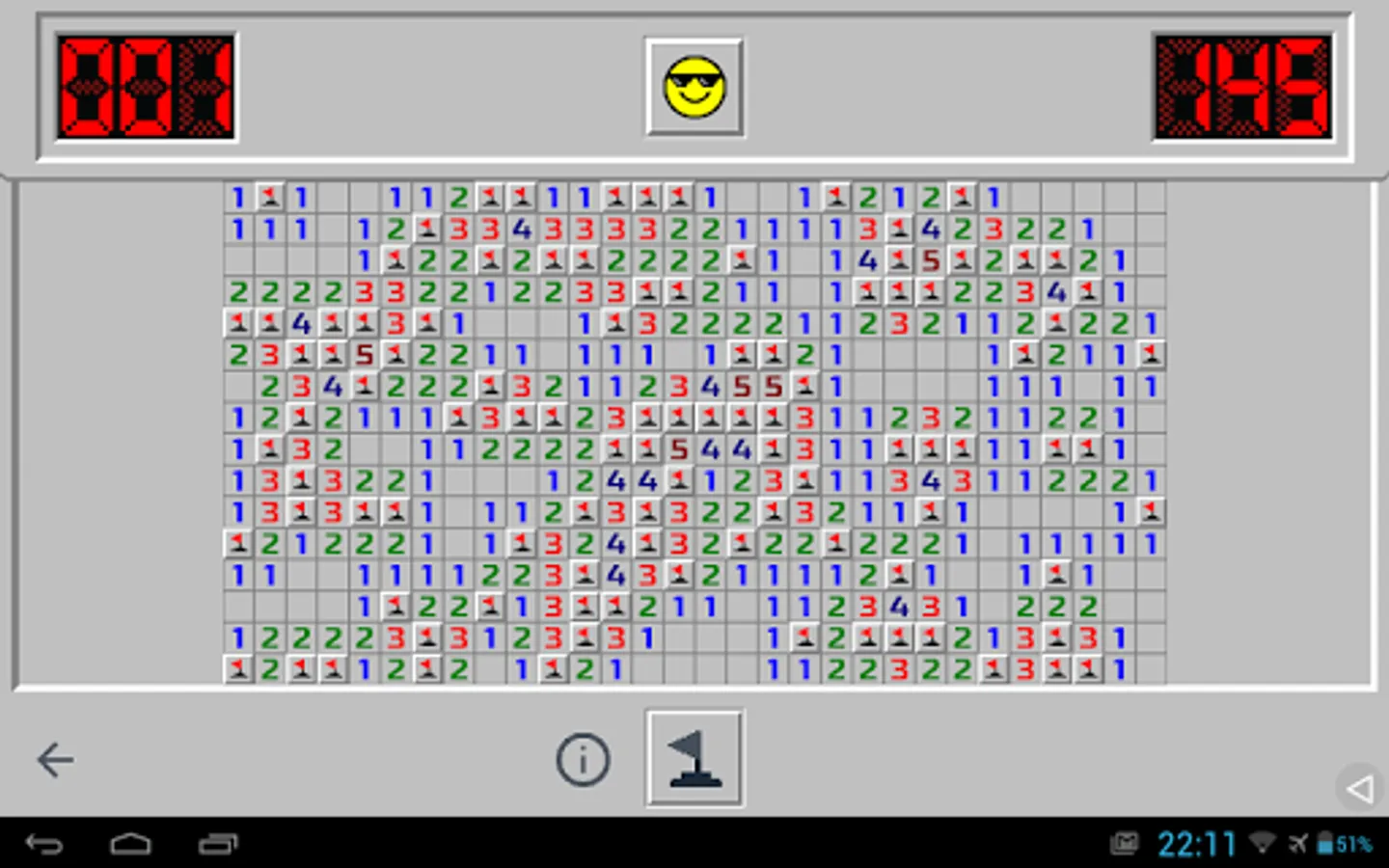 The objective of the minesweeper game is to demine minefield without detonating any of the land mines. Use flags to mark mines and tap numbers to open safe squares.