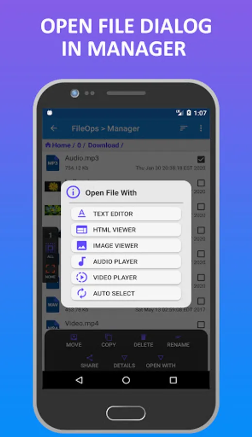 - Open With: Launches a dialog to open file with; Text Editor, HTML Viewer, Image Viewer, Audio Player, Video Player or Auto Select