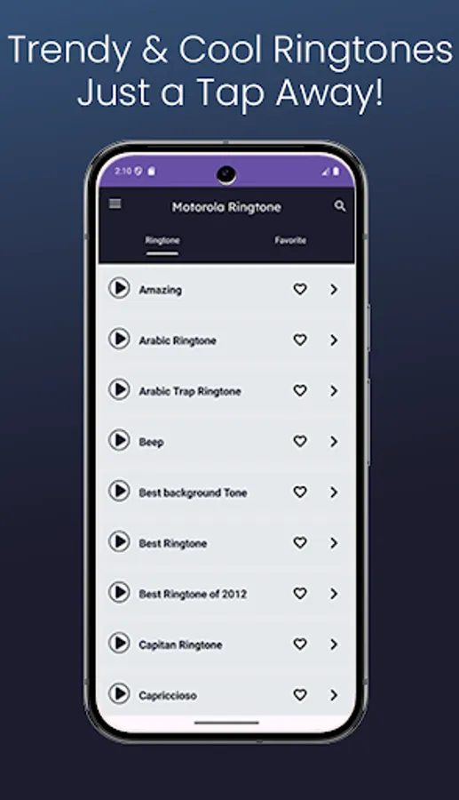 Apply the ringtone to your phone or particular contact in just few simple steps. First select your desired ringtone from the list and then you will be prompted with four Particular options named As Set as Default ringtone through which it will be applied for your caller tune. Assign to a Particular contact and this will set the ringtone for your desired contact. SMS or Notification this will set the ringtone for SMS or Notification. Alarm Ringtone, this will replace your alarm ringtone with our particular ringtone of your desire. You can also share the ringtone with your friends and family. You can also share the Motorola edge 50 ringtone app.