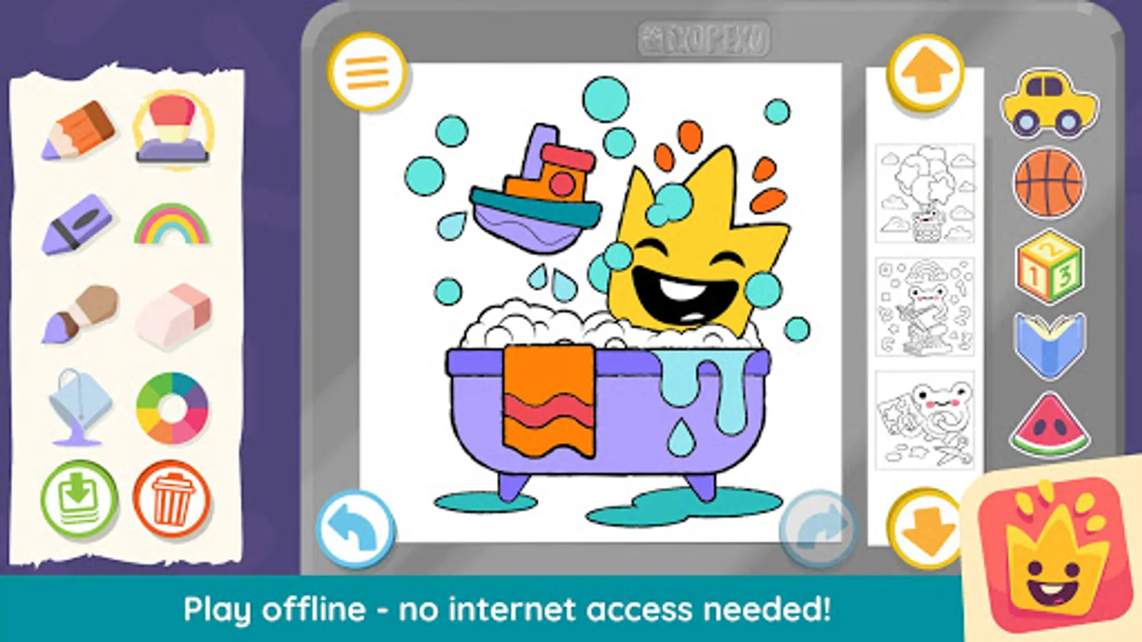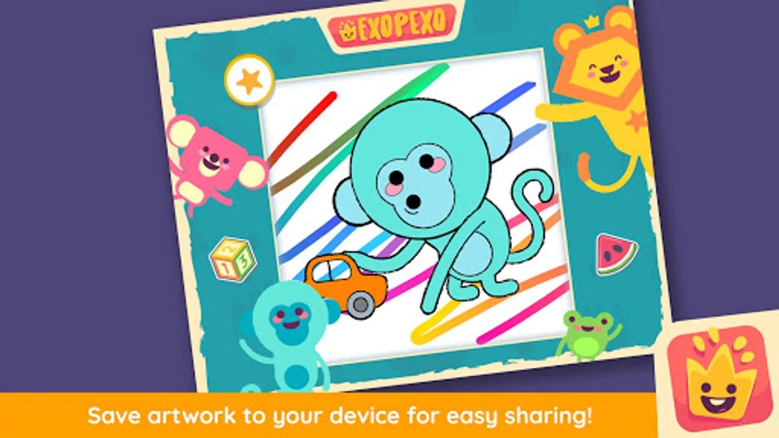 Exo Pexo Draw and Paint helps kids explore their creativity in a fun and safe environment. With a simple to use interface, kids use stamps, pencils, crayons, paint and more to create art. Perfect for road trips or when there is no cellular or wifi data available, art can be saved to your device for sharing with friends and family.