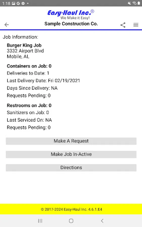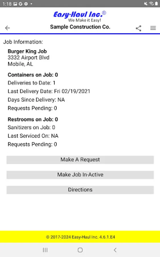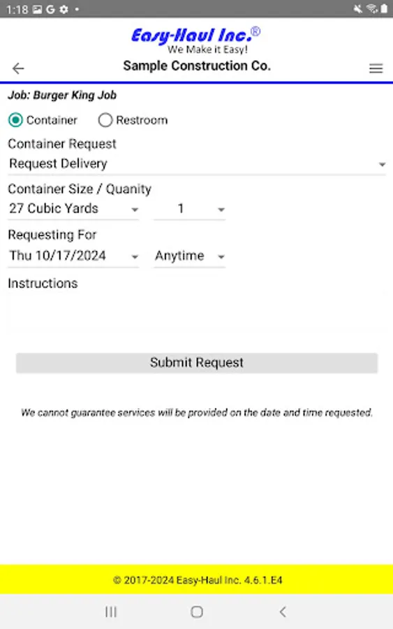 The Easy-Haul App makes using our service easy. Customers quickly and easily request delivery, pickup and replacement or our waste containers and portable restrooms with our service area of South Alabama.