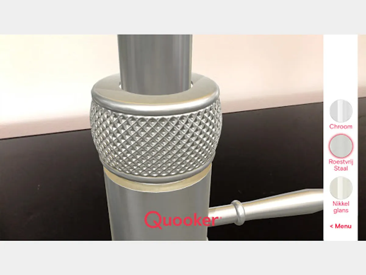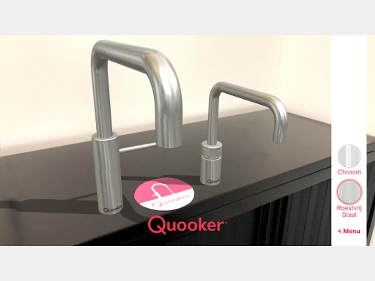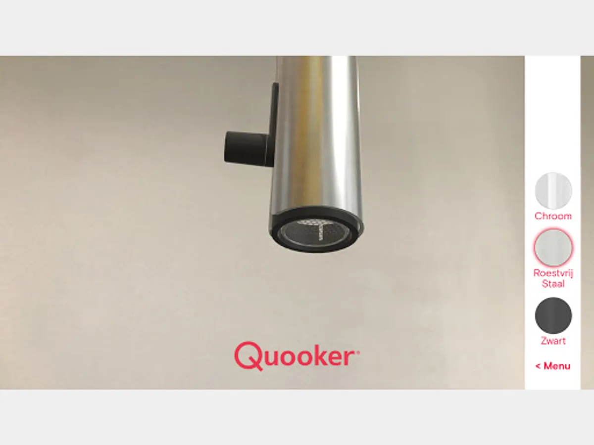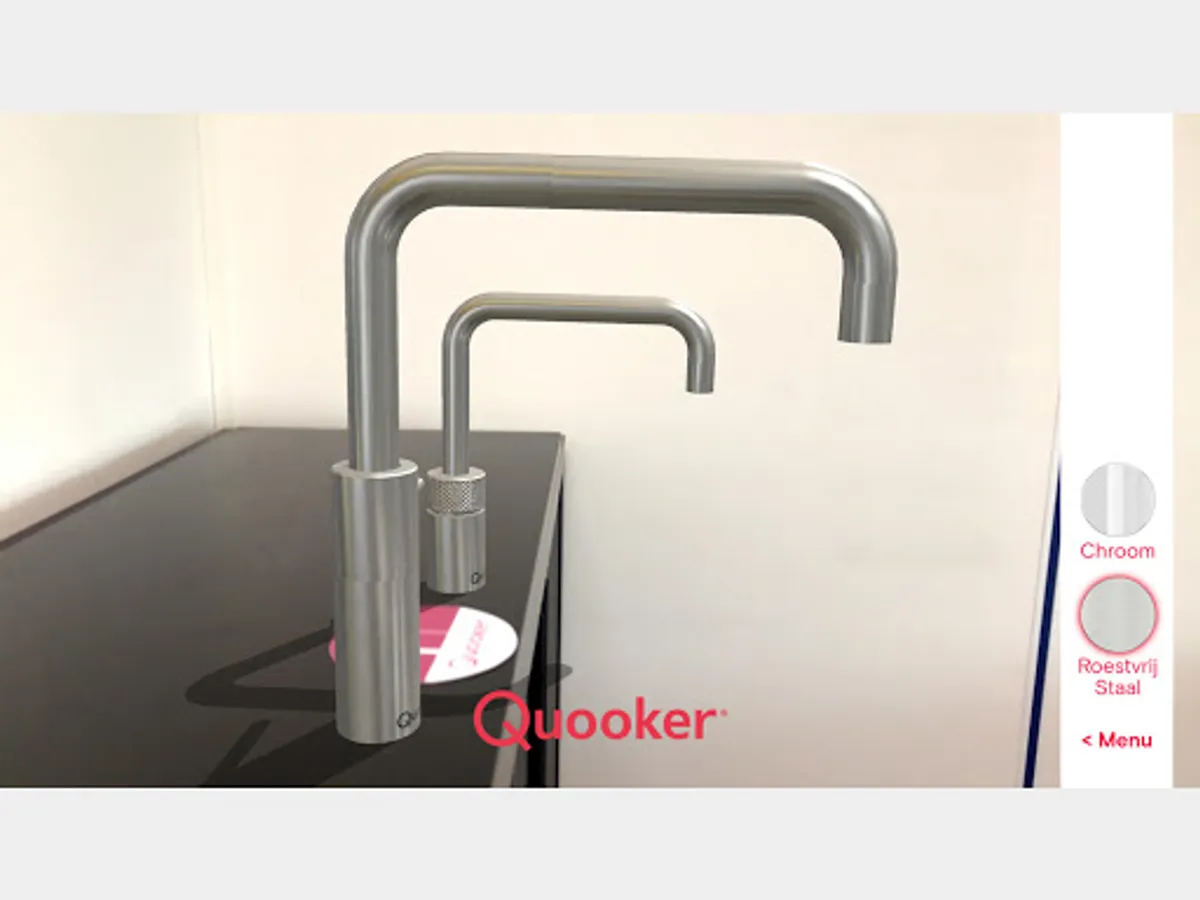 Select the tap in the overview menu and switch between the different tap finishes. Select 'Menu' to return to the overview menu. Have fun using the Quooker Augmented Reality App!