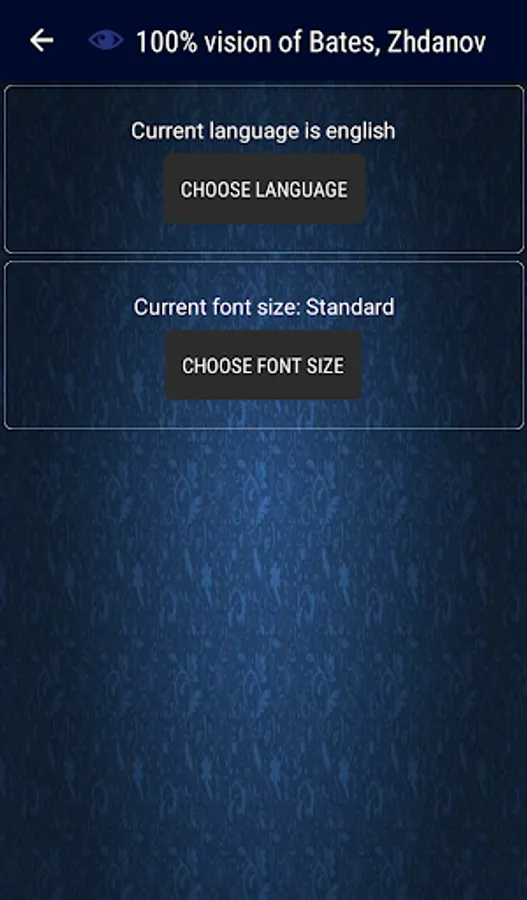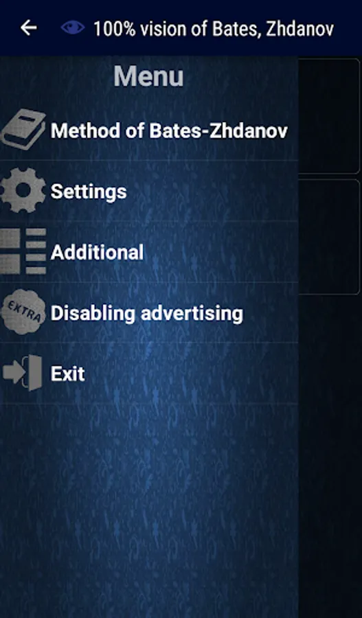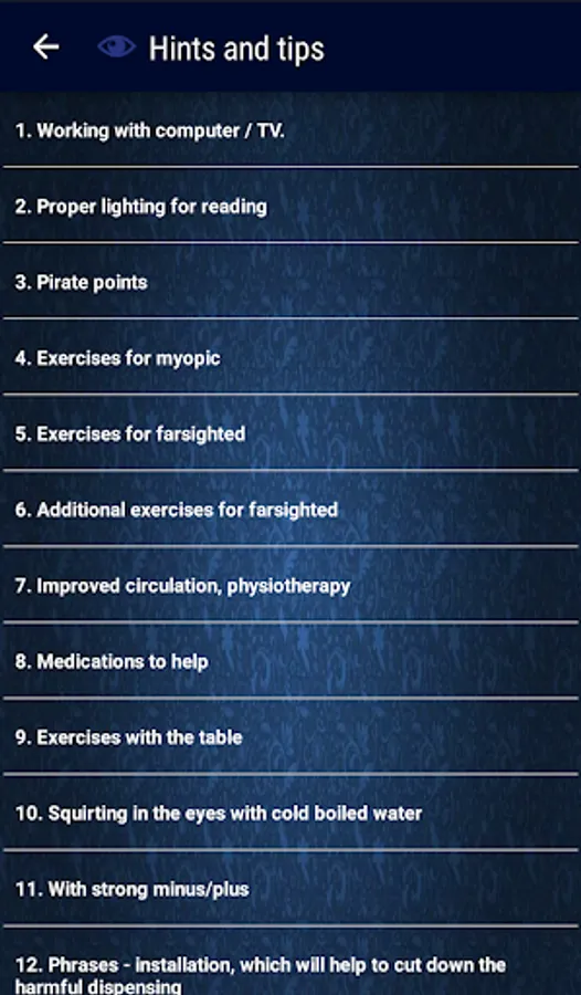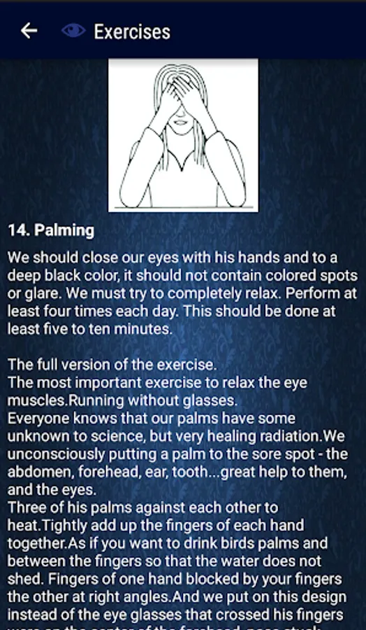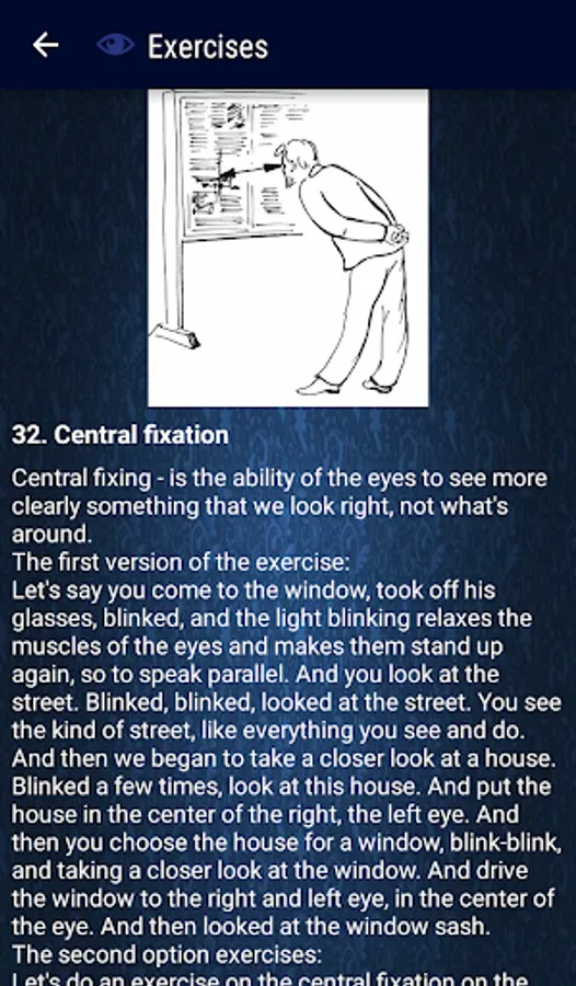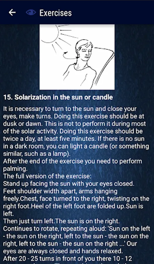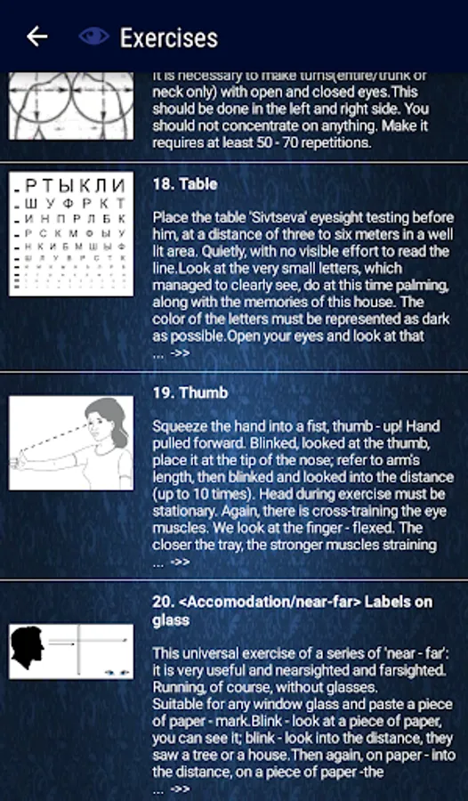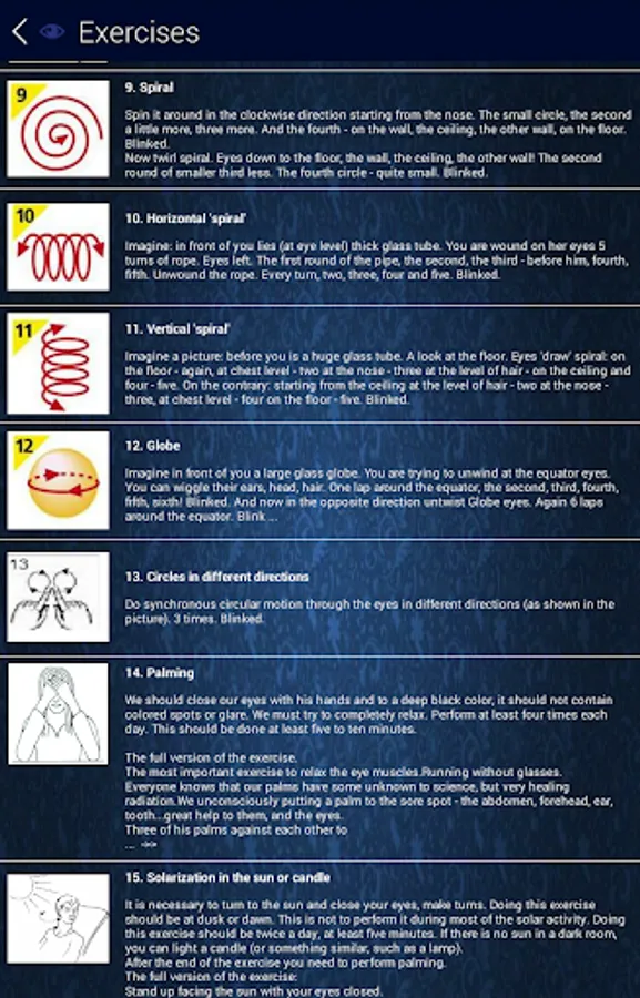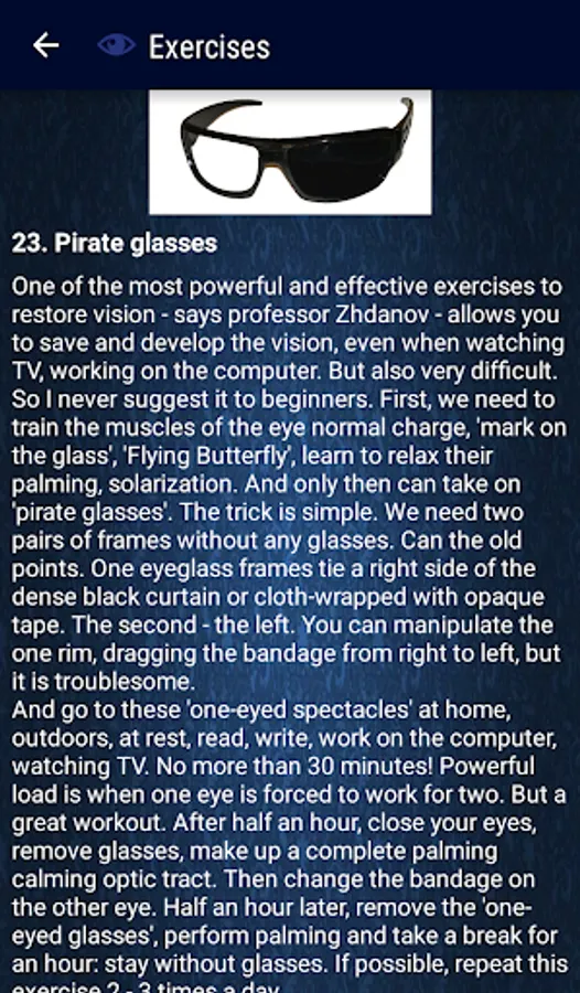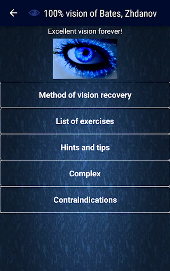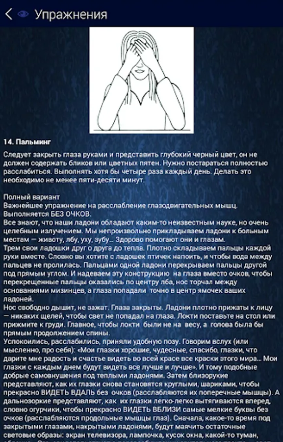 In this application you will find everything you need to recover your eyesight up to 100%! We offer the effective exercises, various recommendations, tips to recover one's eyesight up to 100%. These exercises, tips, etc. based primarily on the method of William Bates, and his successor, VG Zhdanov.