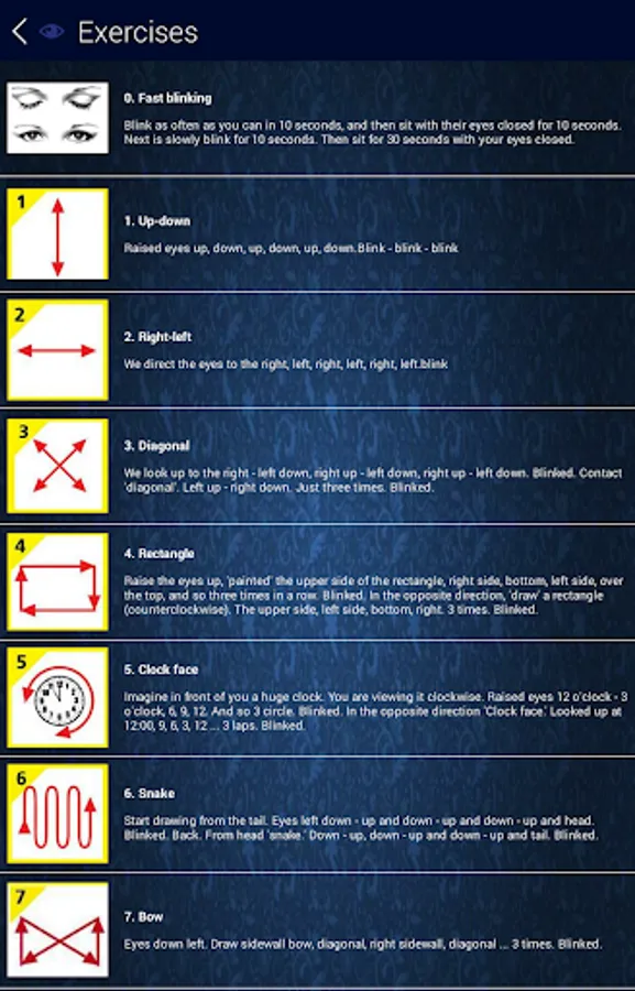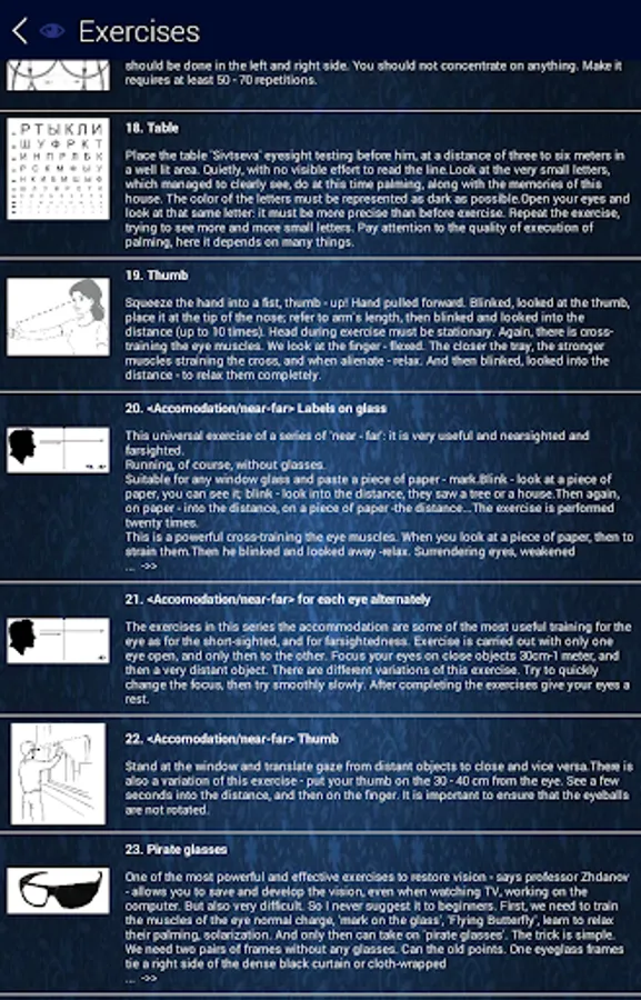 'List of exercises " contains complete list of the exercises to train one's eyes.