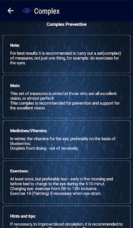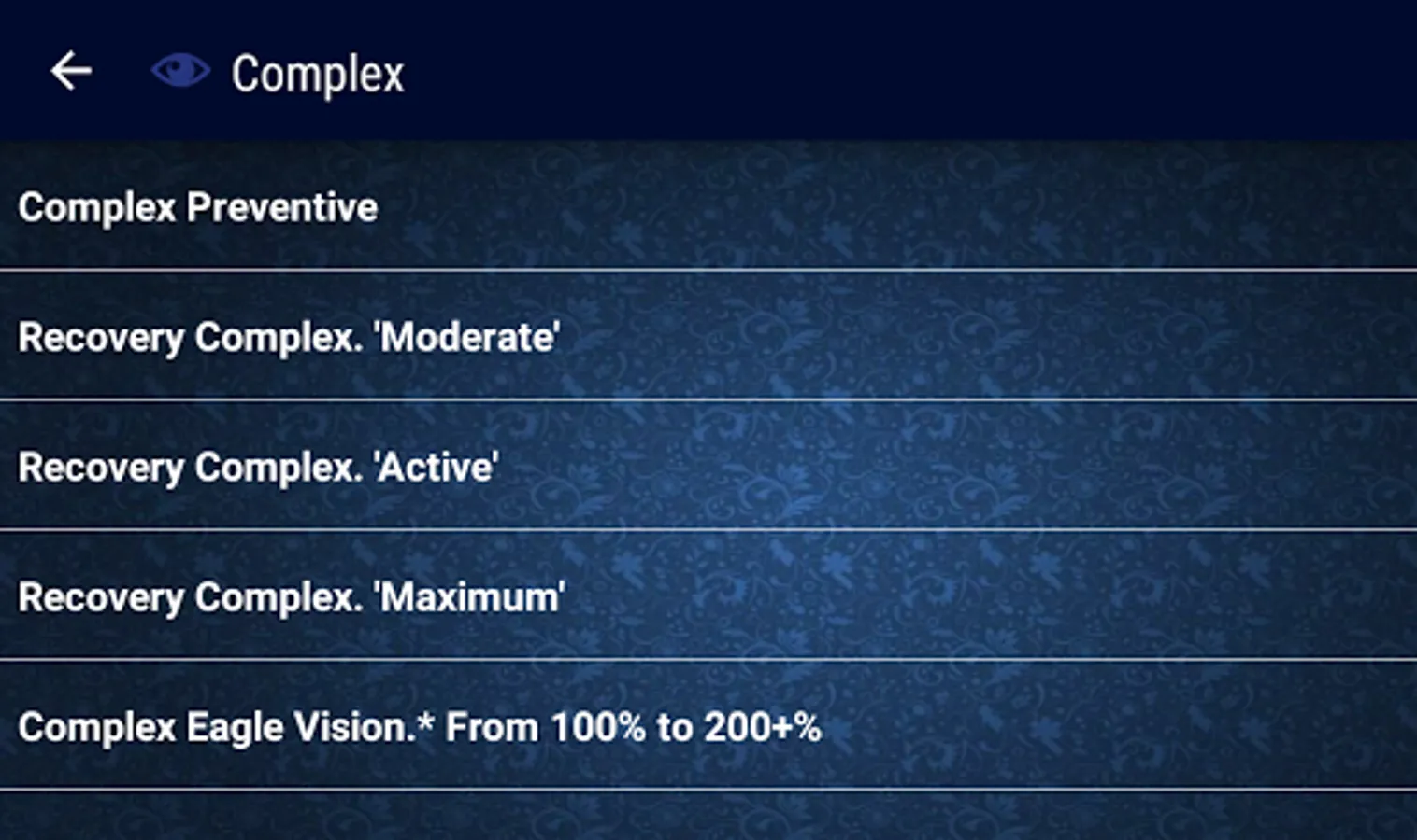'Complex' offers you several sets of comprehensive measures to restore one's eyesight and it consists of the most effective exercises for the eyes, various recommendations as well as medicines.