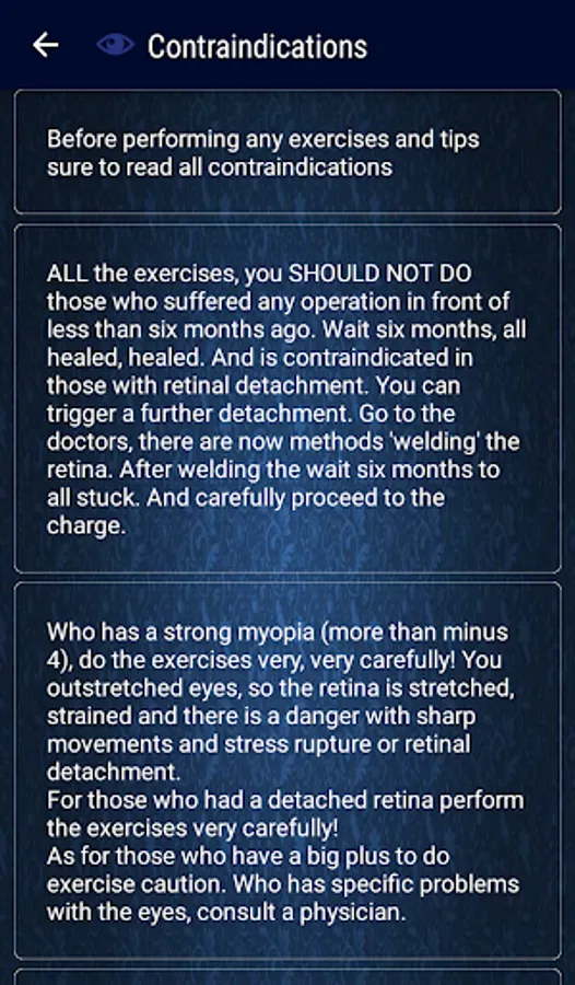 The application contains a description of the method, exercises for eyes, tips, recommendations, and contraindications.