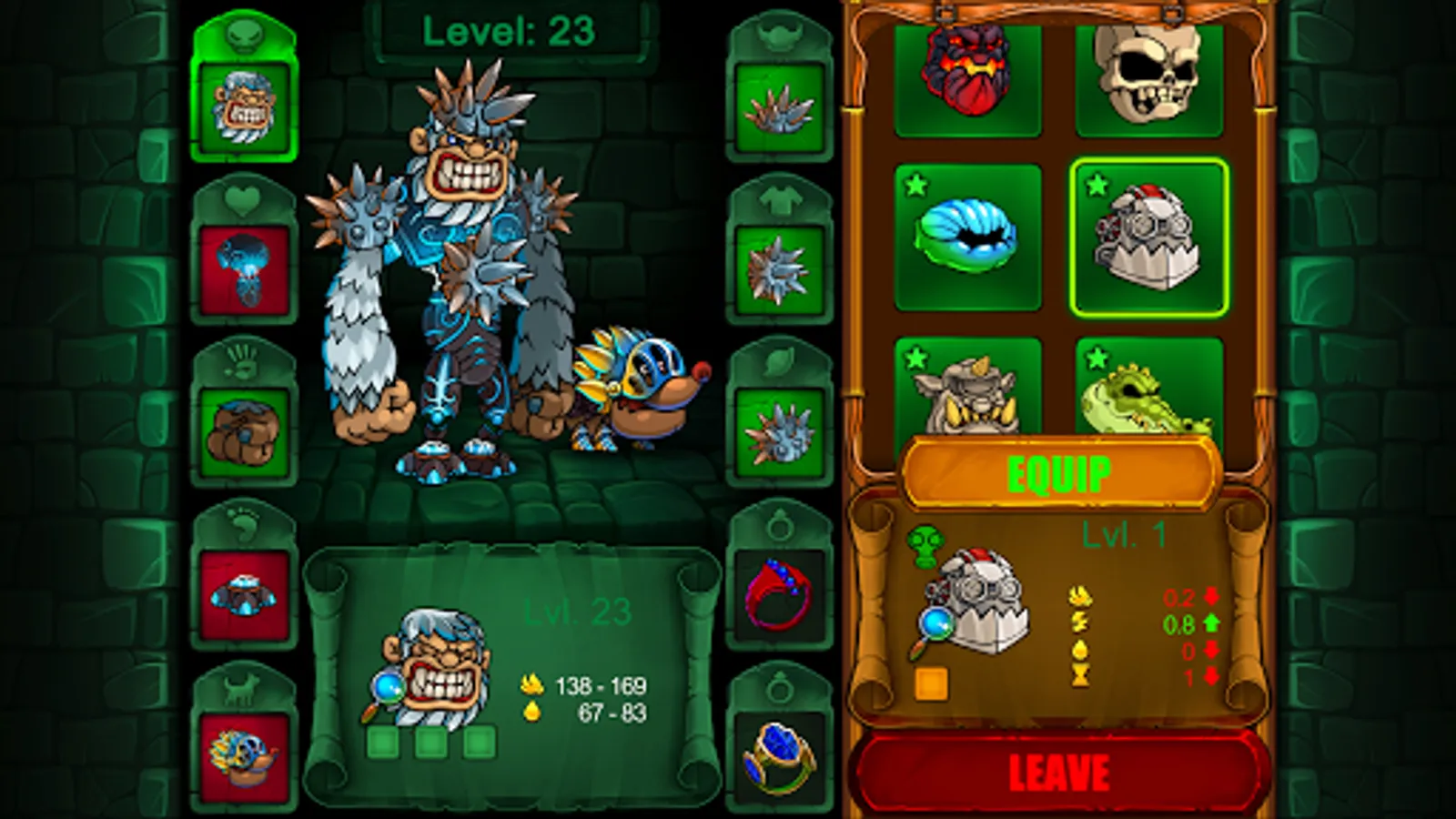 Create your custom monster from various body parts just like Frankenstein! Mix all kinds of legs, arms, head types and equip it with proper armor.