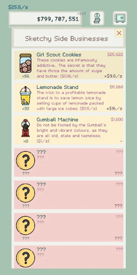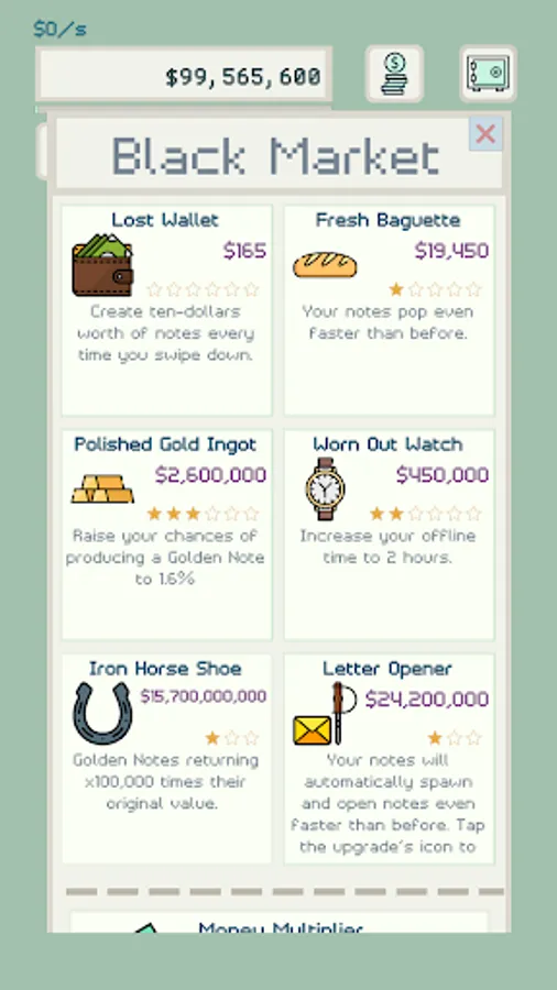 Pixel Fiat, a brand new approach to the increment genre. It is not just another idle game. With these new in-game mechanics, your goal is to accumulate a hefty fortune by tapping notes to break them into smaller components. Collect earnings every second by acquiring businesses in the shop menu. Increase the value of your notes by investing in various upgrades and perks.