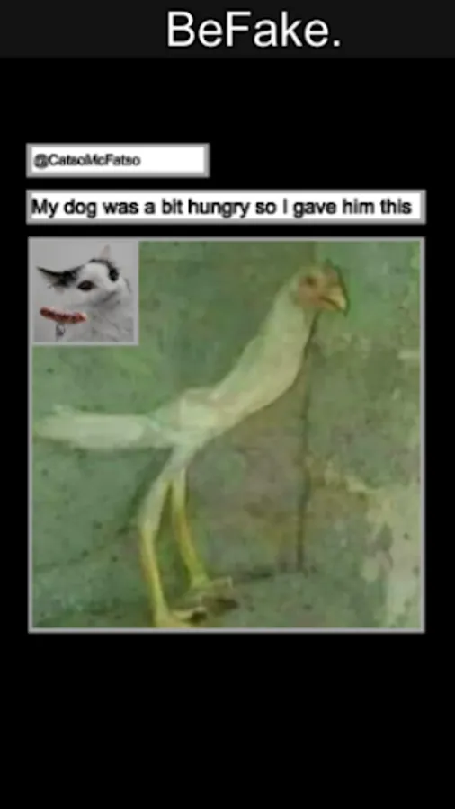 BeFake is a parody of a certain app where you take a picture of yourself daily, except this time random bots are the only onces that can post. Enjoy looking at incredibly dumb pictures that make no sense at all with a weird caption and username with it.