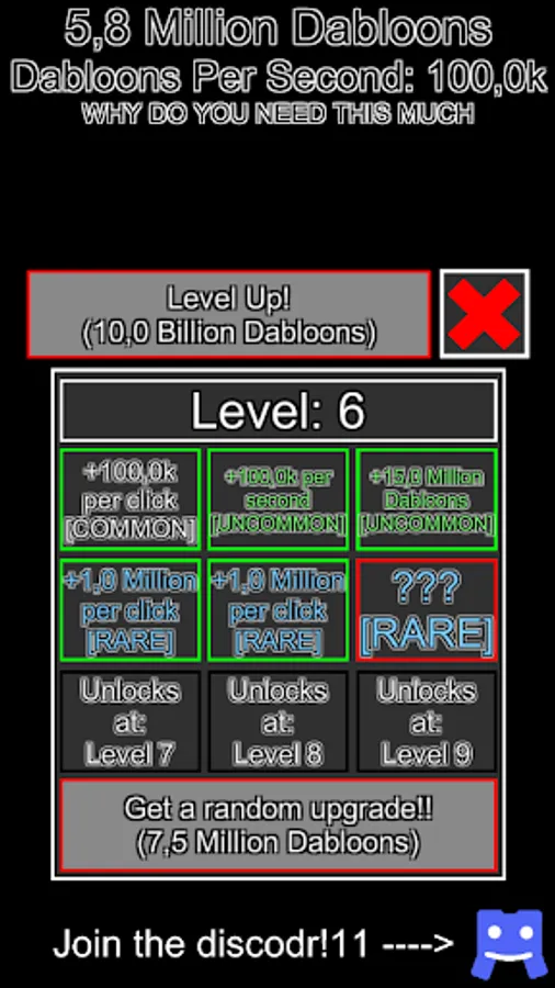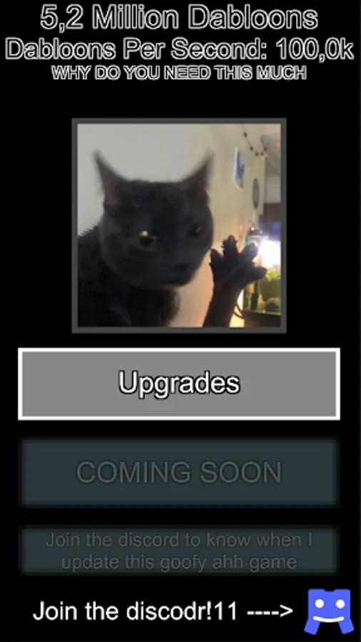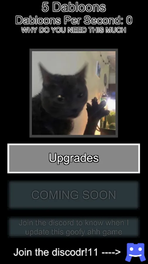 uhhhhhhhhhhhhhhh u click a cat to earn dabloons and buy upgrades and then do cool things and then you join the uhh thing and hey Idk what else to say but I've been working on this dumb app all day, its 2022/12/18 when im writing this. I've been working on this release since the morning, I got school tommorow too. I just wanna make the last details and then play a game and relax. I also gotta get enough sleep though since I gotta wake up at 6:45. Wait crap this text is supposed to be about the game so yea its cool leave a review or something I honestly dont know. This is all random stuff im making up as im writing. I got winter break kinda soon so thats nice. now play the game you fool!!!!!!!