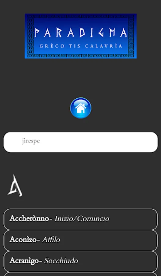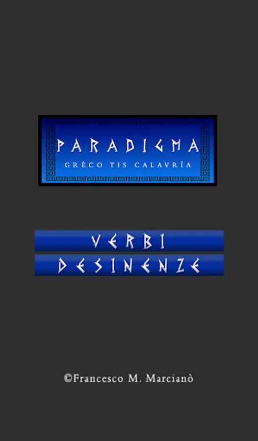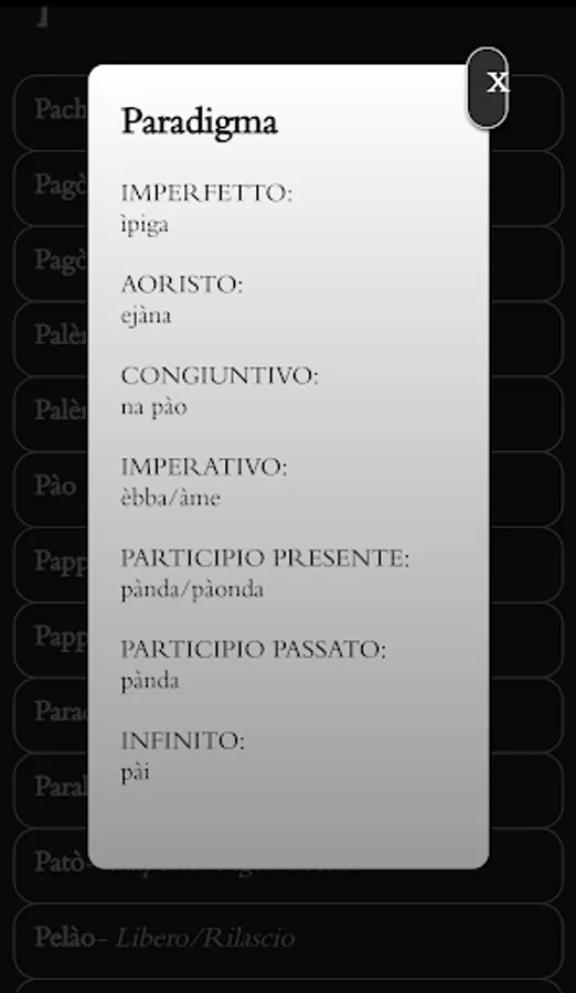 The application contains over 500 verbs in Greek-Calabrian, selecting a verb will show the complete paradigm: Present - Imperfect - Aorist - Conjunctive - Imperative - Present participle - Past participle - Infinite.