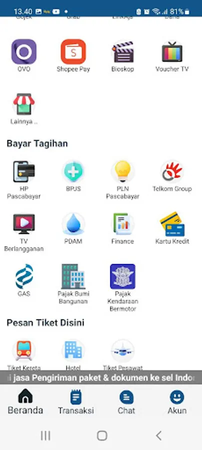 Sales of credit for all operators, tokens, postpaid electricity payments, BPJS, PDAM, hallo cards, pay TV, telkompay, leasing installments,