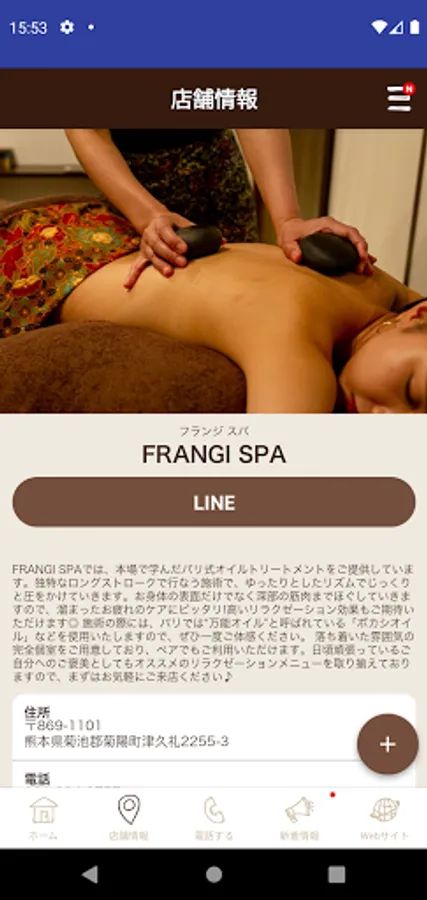 The official app of FRANGI SPA is now available. You can receive new information and deals of "FRANGI SPA" in real time through the app. In addition, you can check and make reservations for menus and desired time zones from your smartphone at any time. By installing the app, you can use "FRANGI SPA" more conveniently and easily.