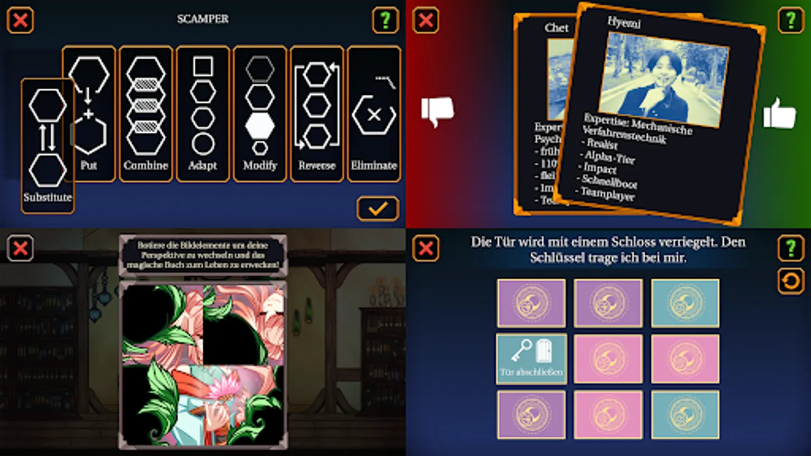 Many different mini-games will challenge you on this fantasy adventure journey. Master them to unlock needed items and expand your knowledge. At the same time you will learn a lot that is important when it comes to good ideas for solving earthly problems. Because this game offers more than just entertainment: you will also learn many important things about finding ideas, developing ideas and founding a startup. Quest of Gelduba helps you to find out what's really inside you and what your heart beats for.