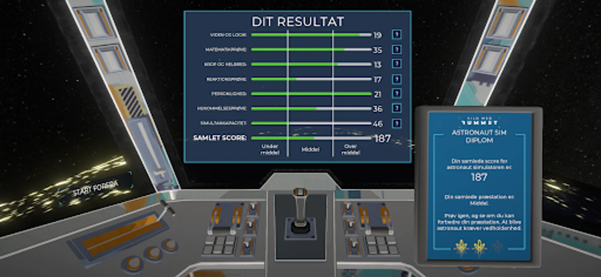The Astronaut Test is a mobile game for space enthusiasts of all ages. In the Astronaut test, you will be challenged on knowledge, responsiveness, memory and the ability to multitask. You earn points in each test, and eventually you get an overall rating.