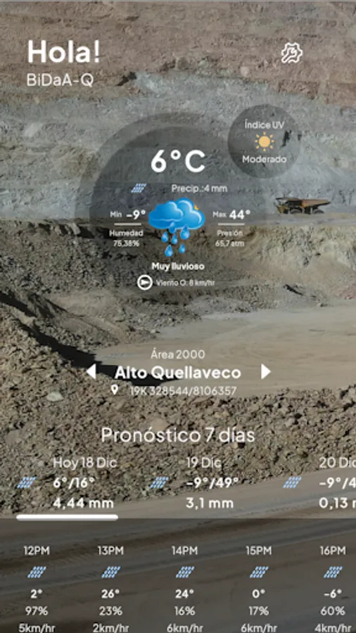 The weather app for Quellaveco, Peru, offers accurate, real-time weather information, designed specifically for local needs. It allows you to consult the current state of the weather, including temperature, humidity, wind speed and direction. Additionally, it provides detailed forecasts for the coming days, which helps plan activities in this mining region.