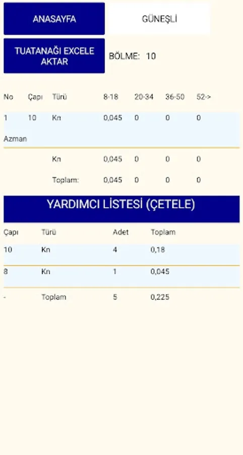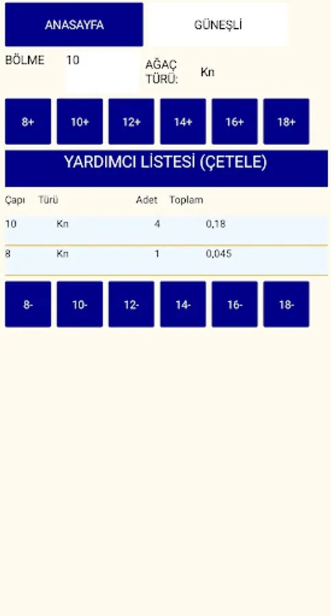 You can create a size list by typing in length, diameter and quantity. It does all calculations automatically without the need for a calculator.
