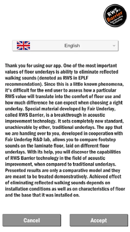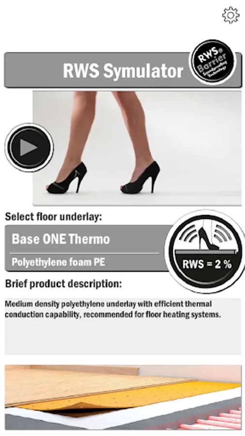 This application allows you to simulate the sound of footsteps on the different floor types installed over different floor underlays. Thanks to this mobile app, you will be able to understand important difference in floor usage comfort in reflected walking sound elimination when using RWS Barrier technology based underlays, in comparison with traditional floor underlays.