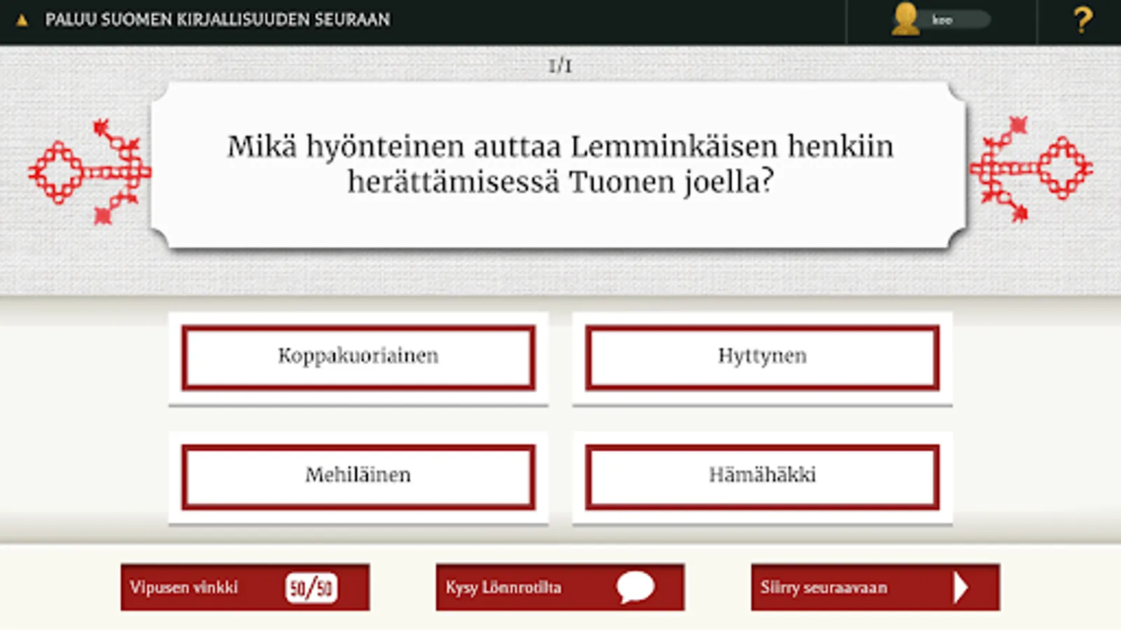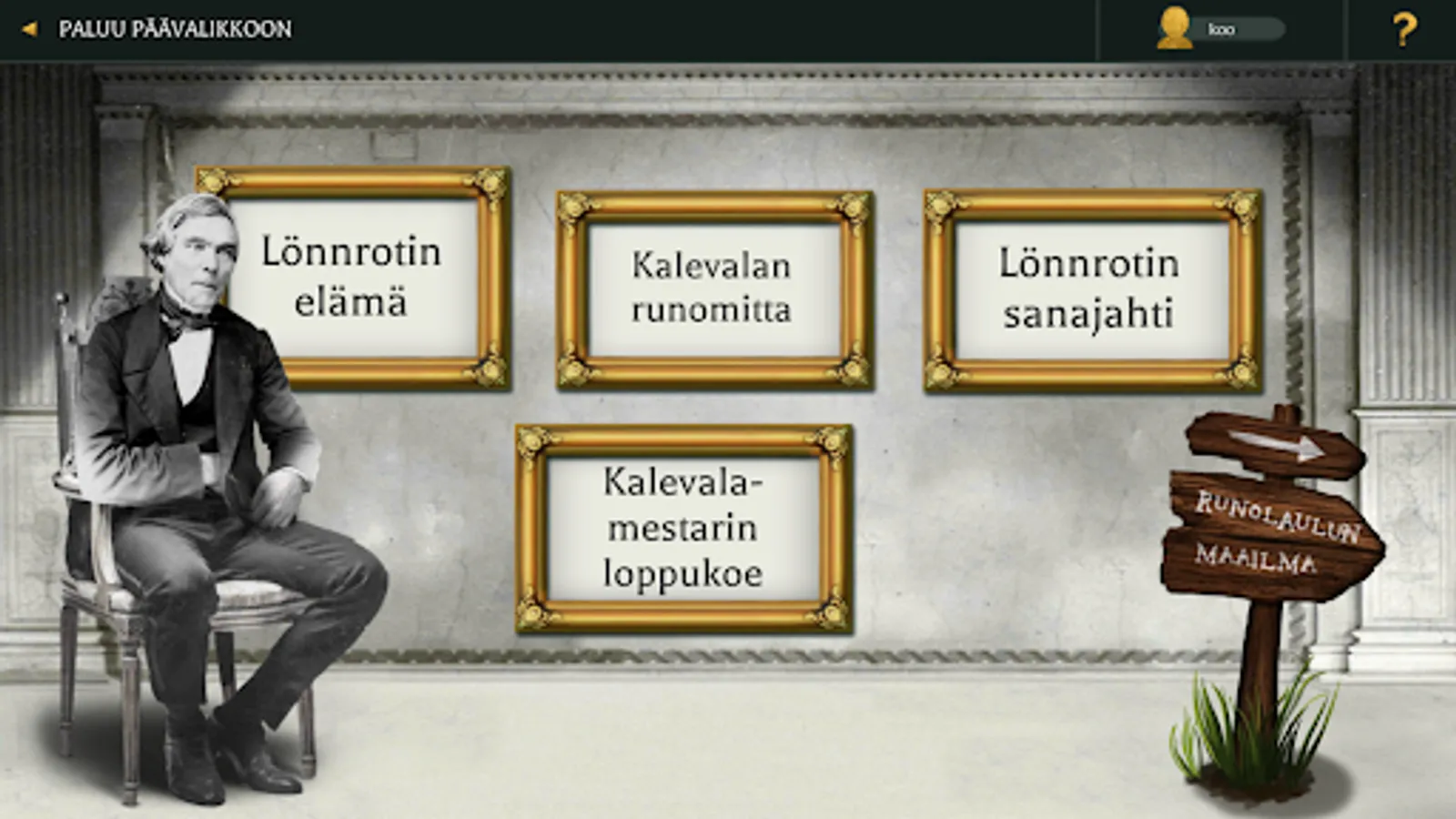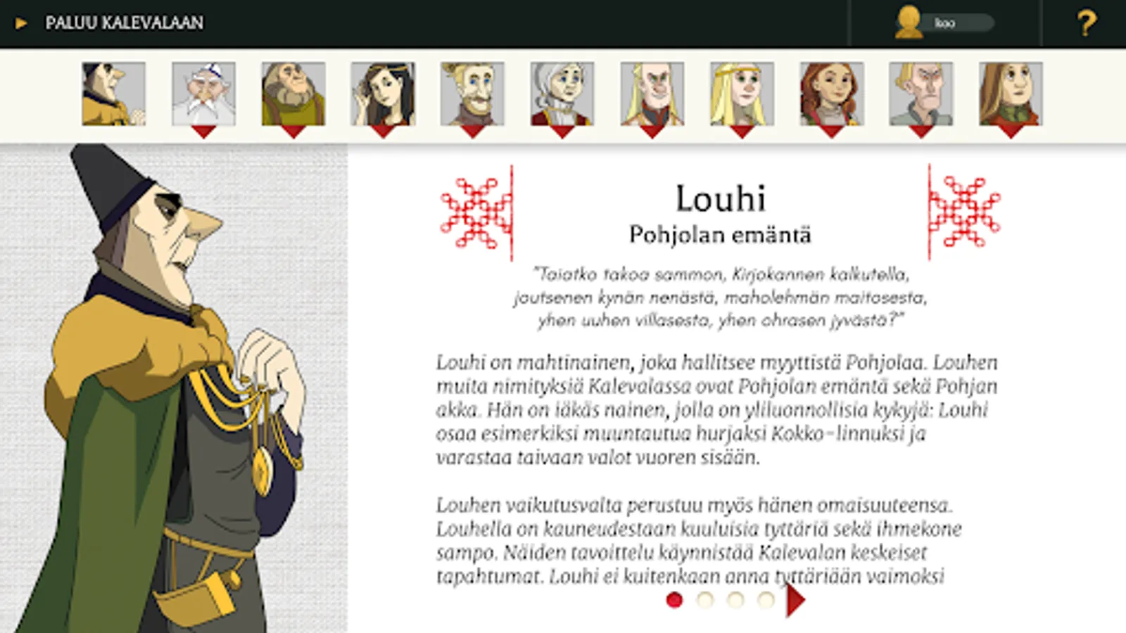 Sampo's Salat is a new way to experience the Finnish national epic Kalevala. The application includes an abbreviated version of the Kalevala by Lönnrot for schools, game scenes, a lot of learning material and tasks related to Elias Lönnrot and the old poetry culture, among others. The application is suitable for educational use in schools and for anyone interested in the subject, regardless of age.