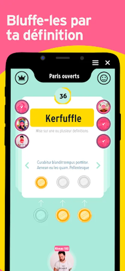 From an enigmatic word, write the most believable and “sexy” definition possible so that other players bet on yours! Conversely, avoid being bluffed and try to bet your coins on the right and unique definition; that from the dictionary.