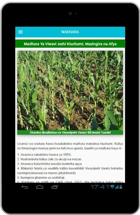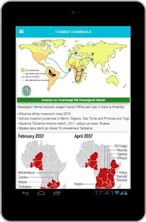 App hii ya kitaalamu imeandaliwa mahususi kumsaidia mkulima, afisa ugani na mdau wa kilimo kuweza kumtambua mdudu huyu, dalili mbalimbali na hatimaye kujua wakati na namna sahihi ya kumdhibiti.