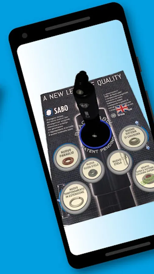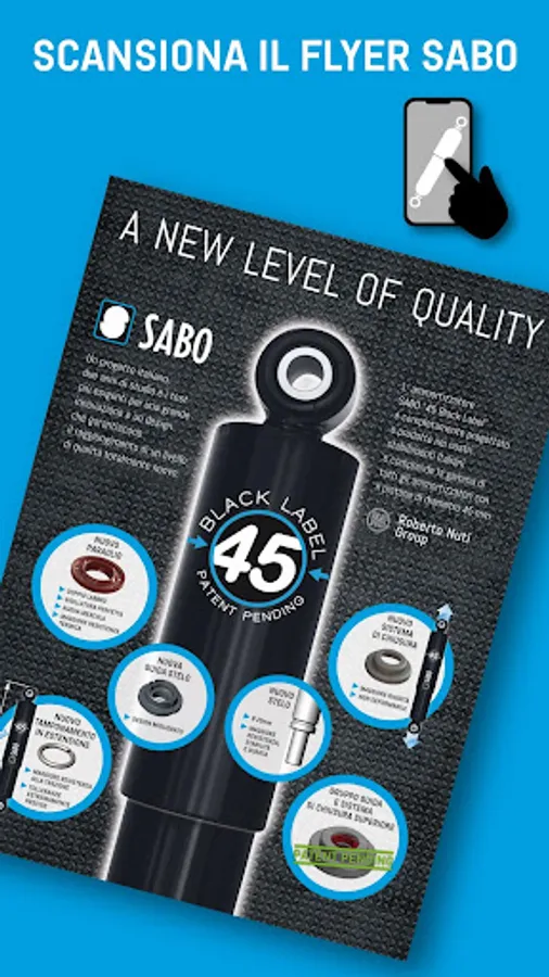 Open the app, scan the SABO pdf, flyer or SABO’s Black label 45 logo and immerse yourself in SABO’s augmented reality: you can interact with our shock absorber, have a close look to the technical innovations and much more.