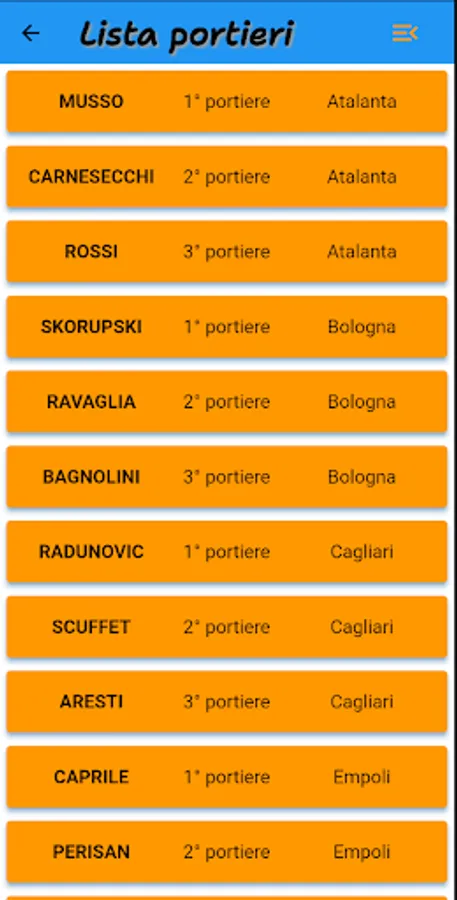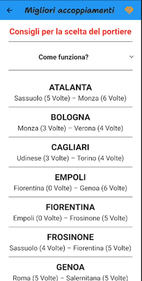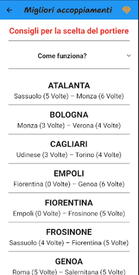 Also to help you make the best choices there are other features such as: the list of goalkeepers, the best pairings for goalkeepers according to the calendar, the specialists in set pieces (penalties, free kicks and corner kicks).