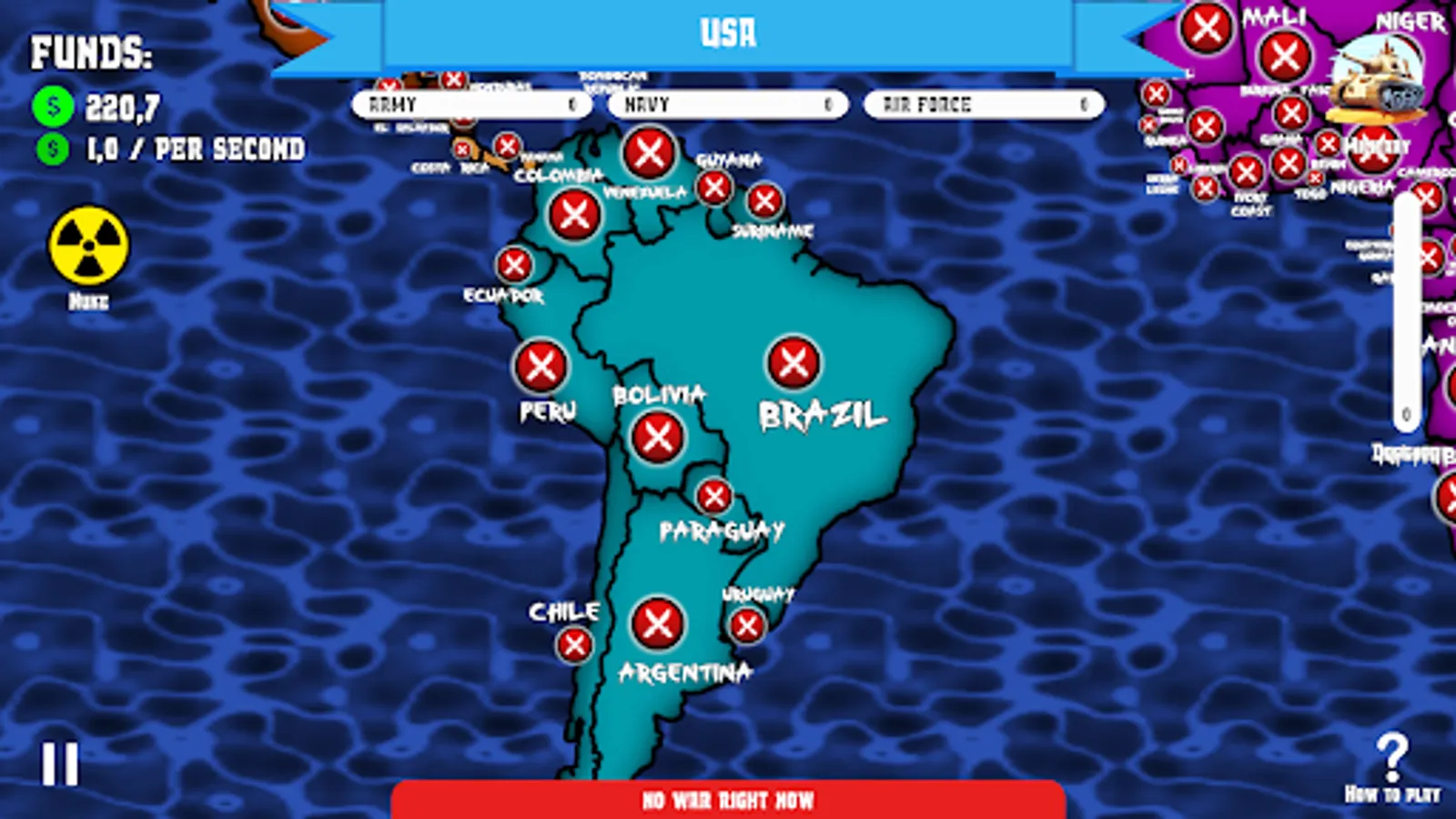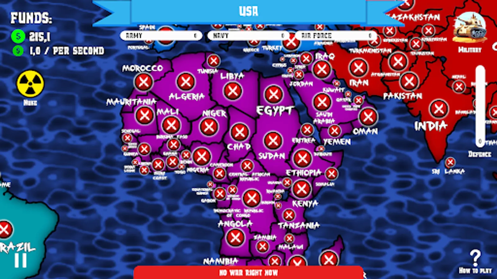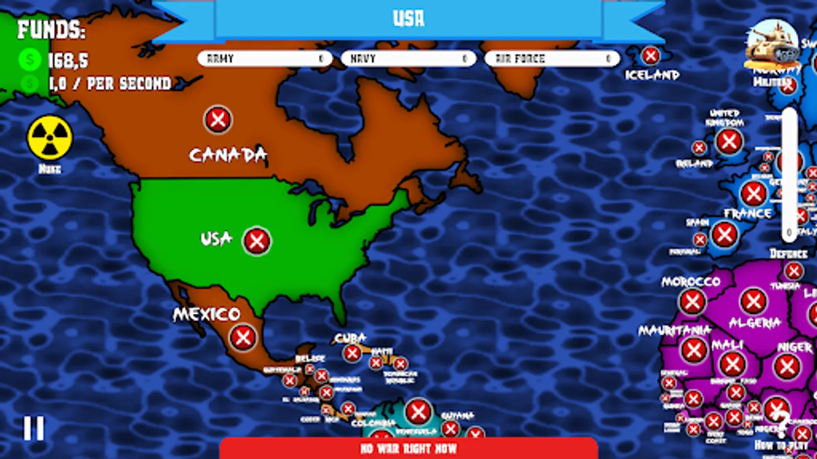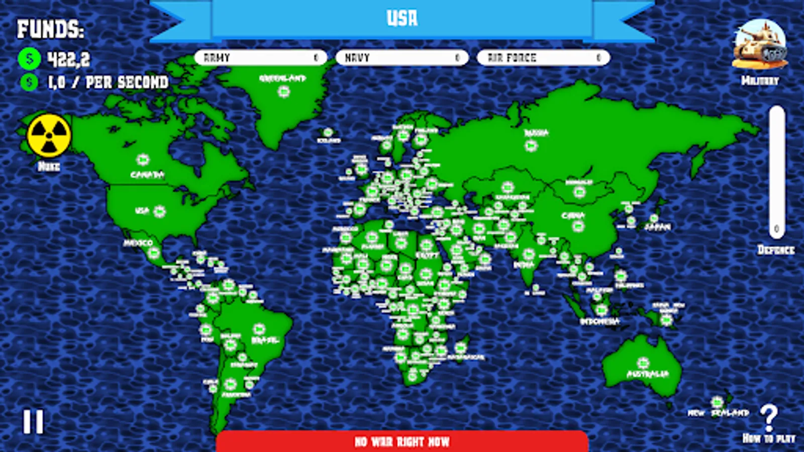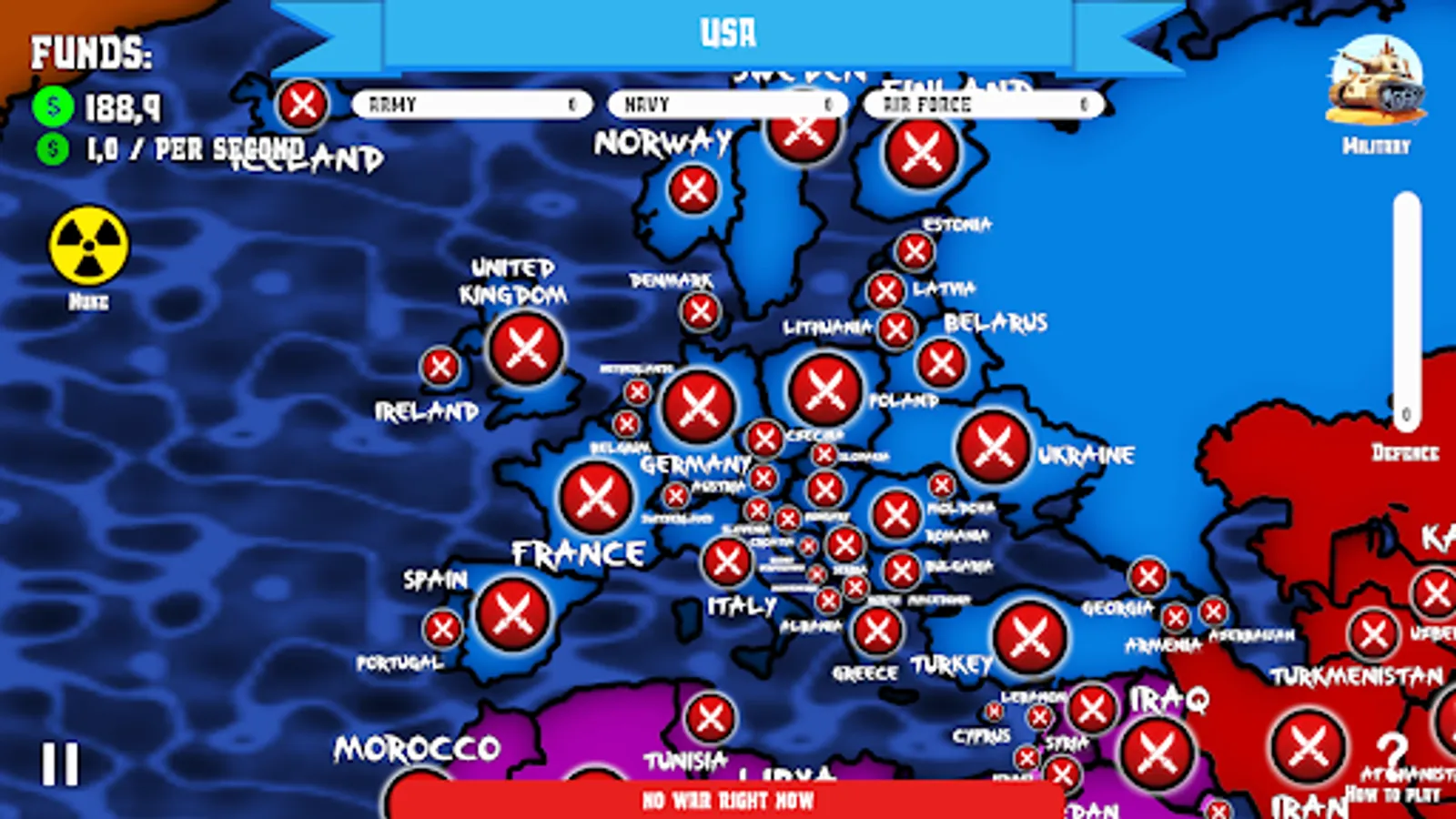 Planet is divided in 5 different regions, your goal is to conquer countries, make their production to work for your army and use it to conquer more territories! Your only way to do it is to upgrade your military in 3 different ways: army, navy and air force. 💥💥