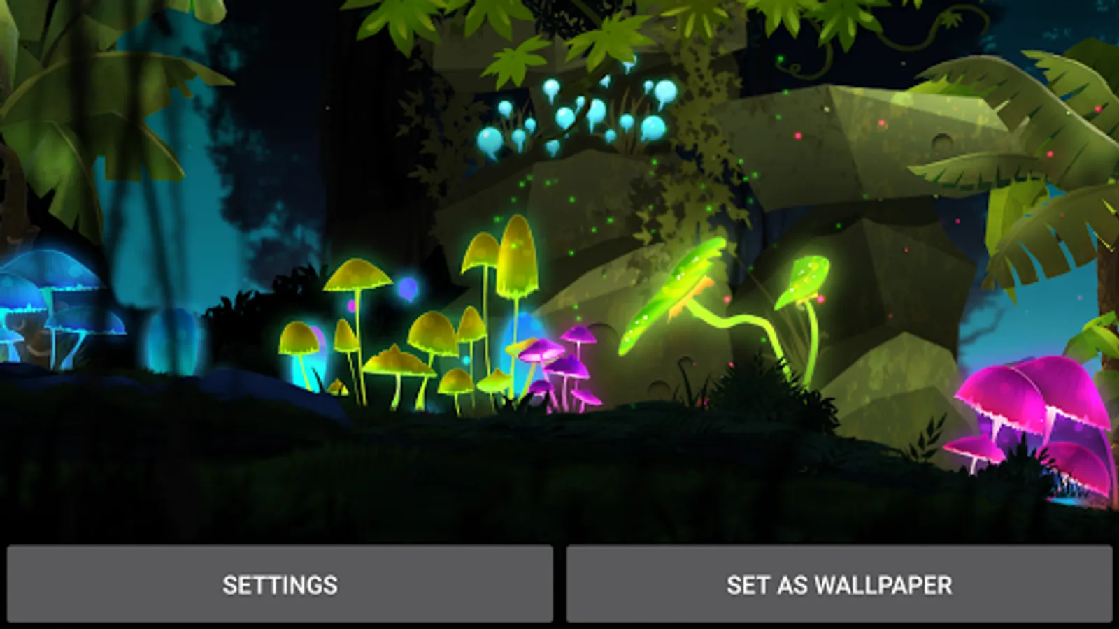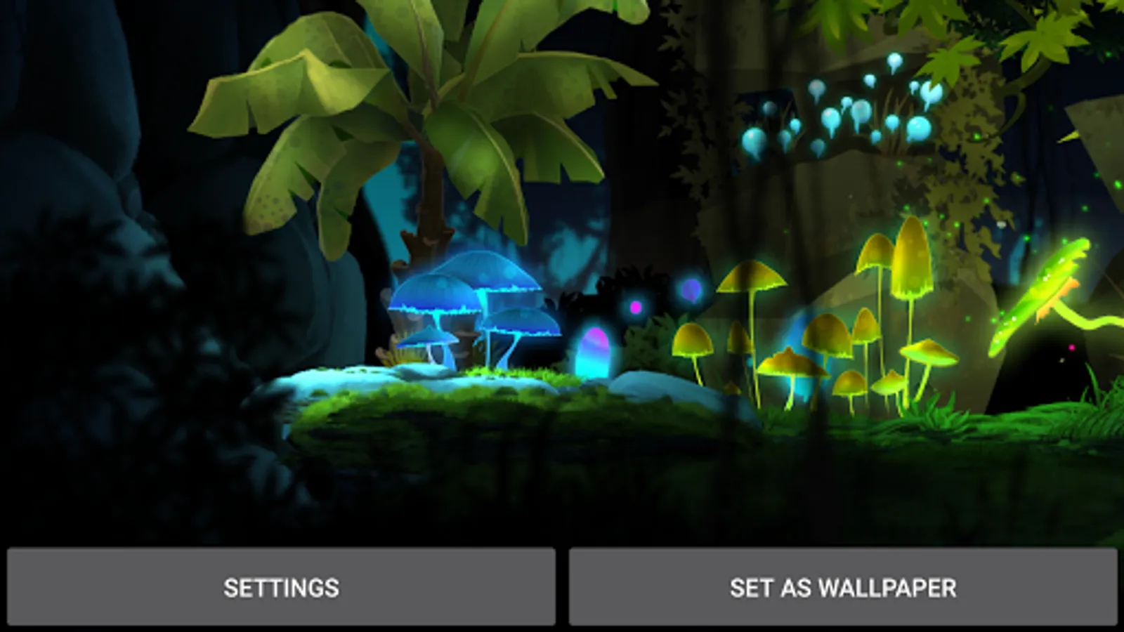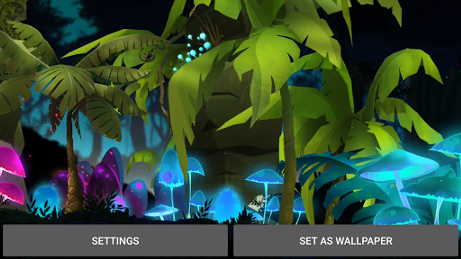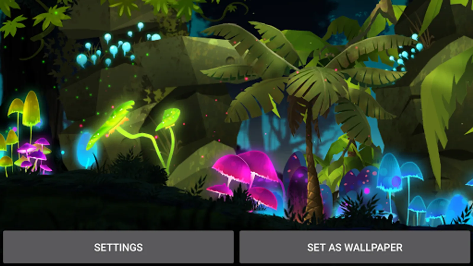 An amazing Gloving Mushroom Forest 3D parallax Effect live Wallpaper on Google Play for your phone or tablet! Fully 3D forest Firefly scene will provide you great mood and keep you calm during a day. Realistic gloving vegetation, colorful tree's and colorful landscape, flying fireflies and amazing alive lighting give this jungle parallax wallpaper very realistic look.