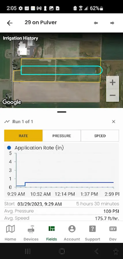 - The Fields screen allows users to manage their fields and view historical irrigation data.