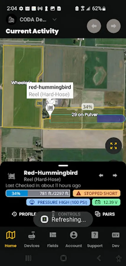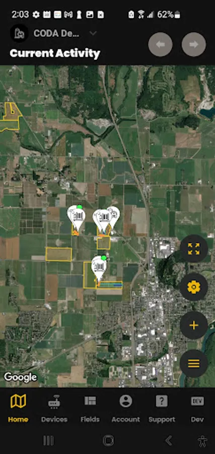 - The Home screen displays current device activity, overlaid onto a map of the farm and its fields.