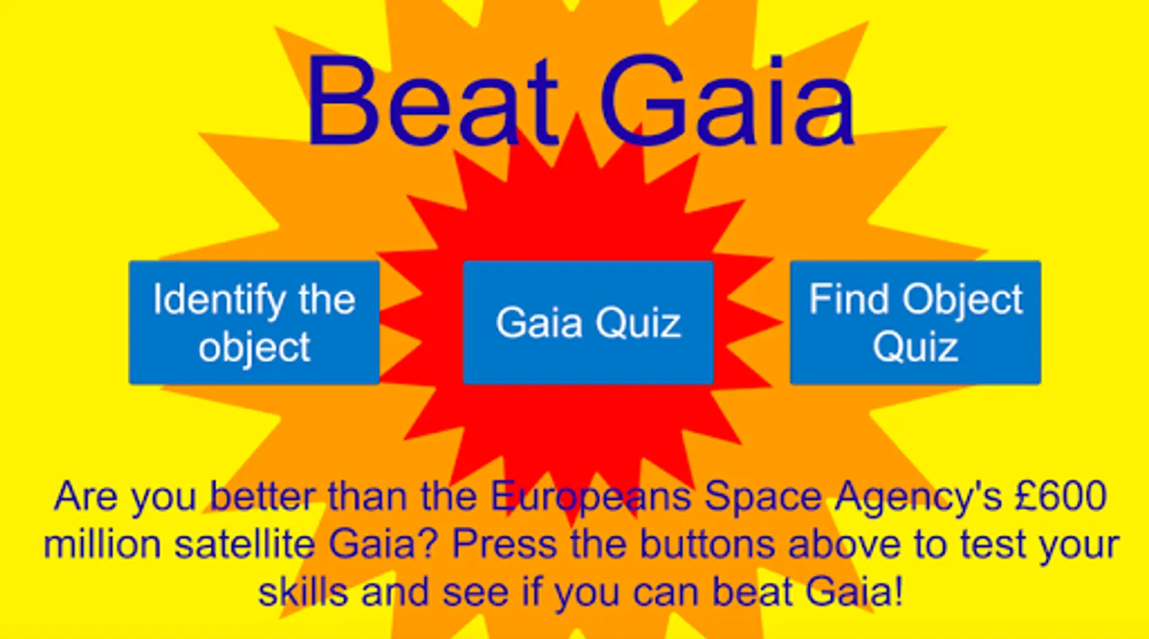 Test your knowledge of Astronomy and of the European Space Agency mission Gaia to see if you can beat the £600 million satellite. There are three quizzes to test your skills: Identify astronomical the object, Find the Stars and the Gaia Quiz.