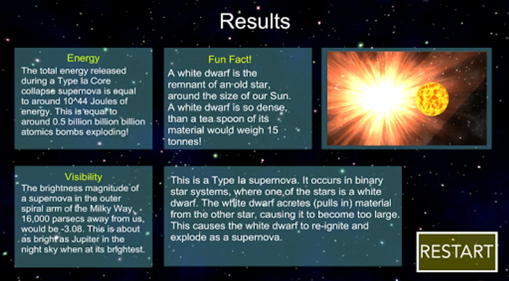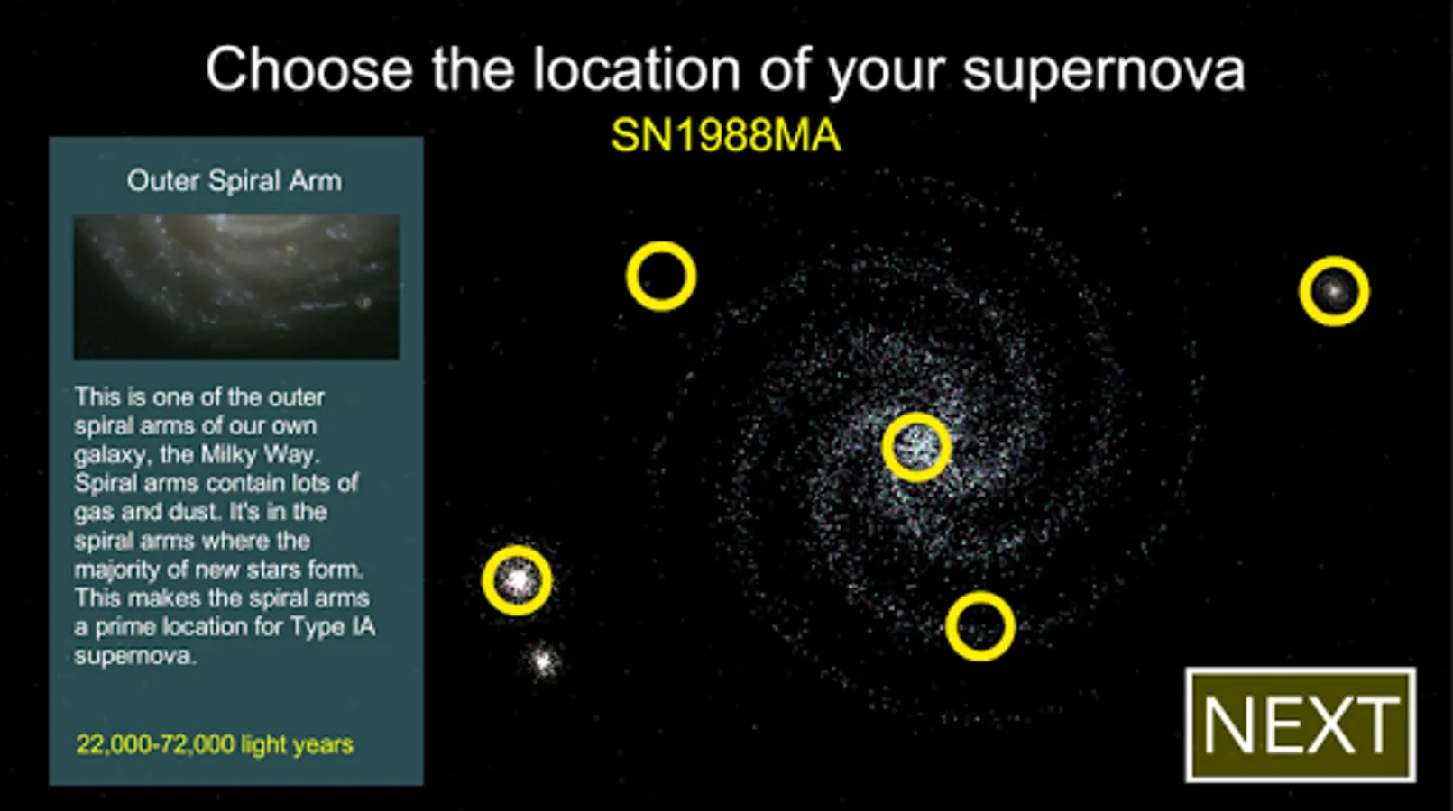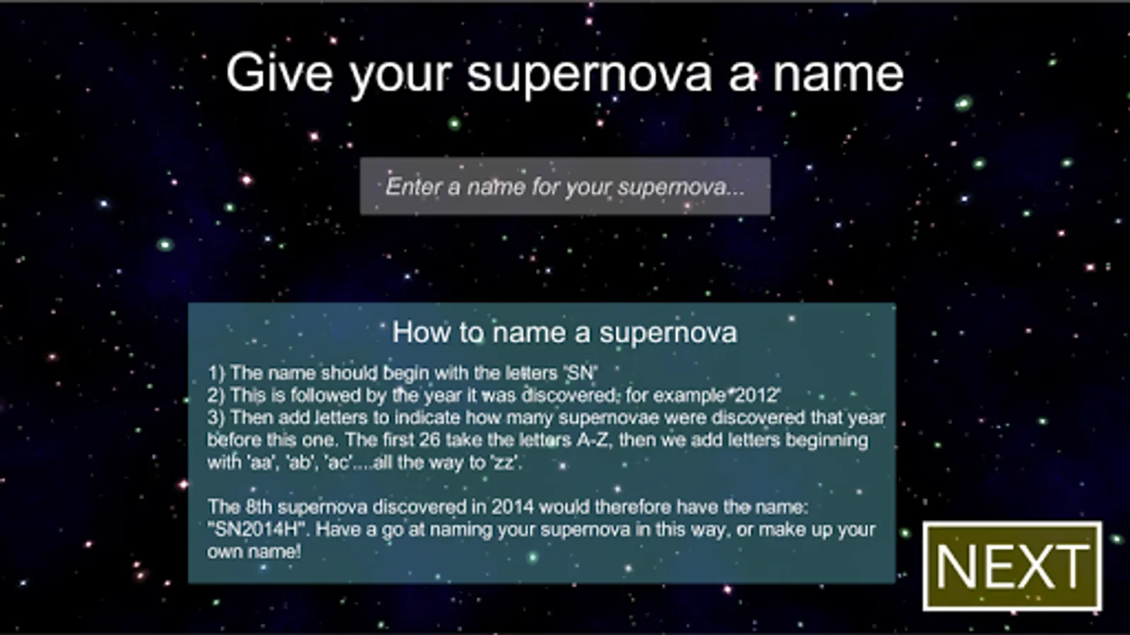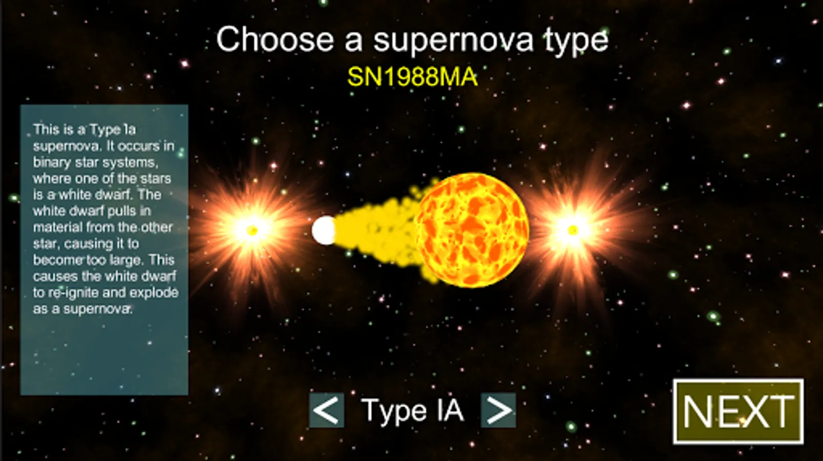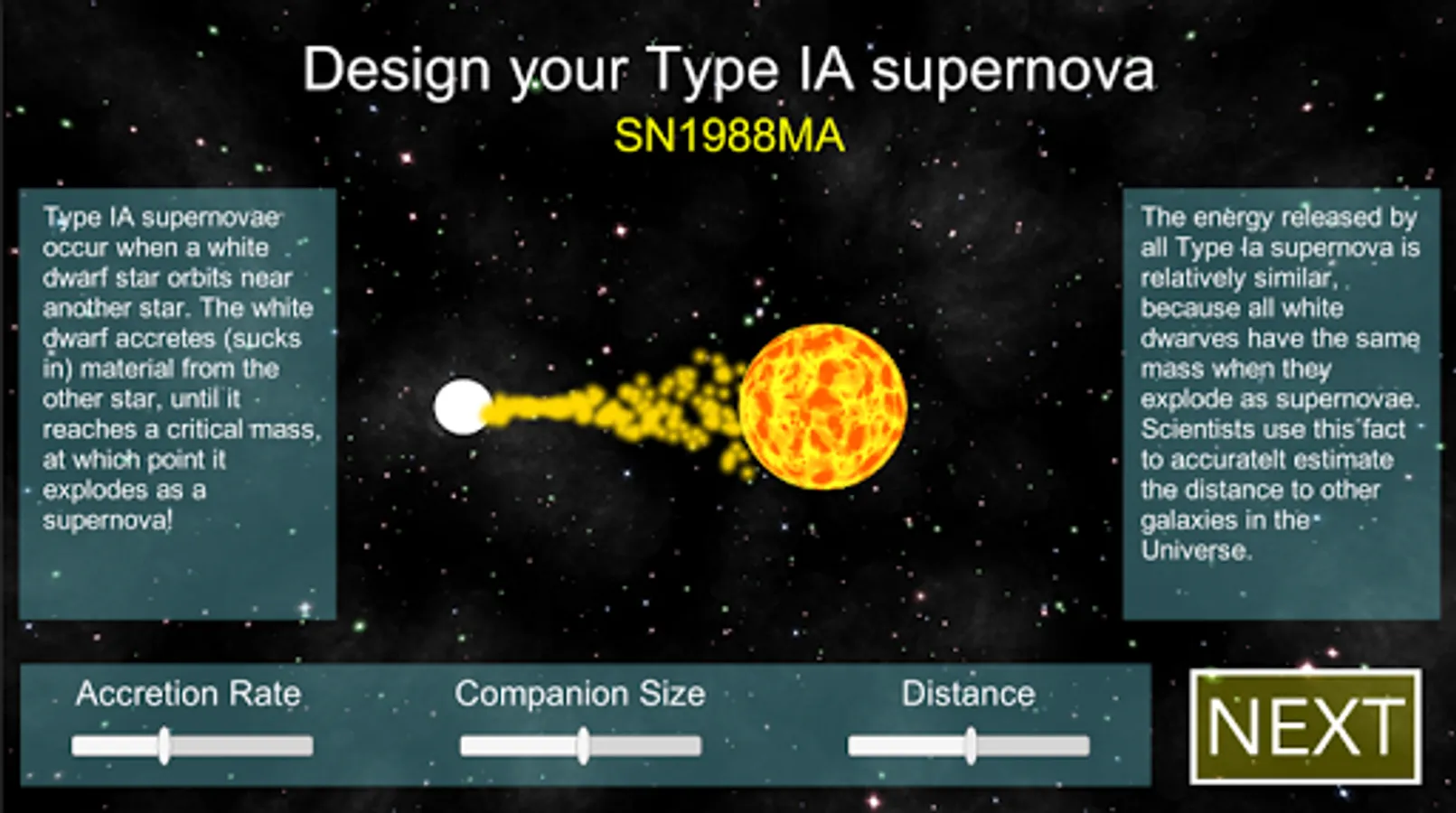 Create your own supernova, choosing how big it is, what type of supernova it is and other properties. Then, watch it EXPLODE and find out how powerful your supernova was. Can you create a supernova that could destroy the Earth? Play around with the app to find out!