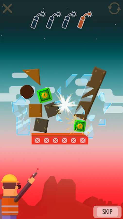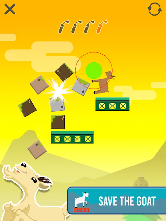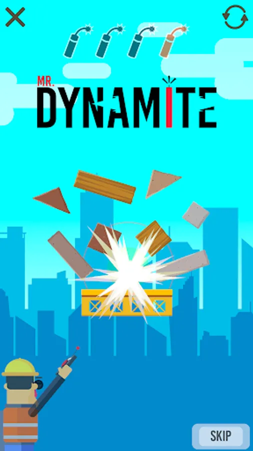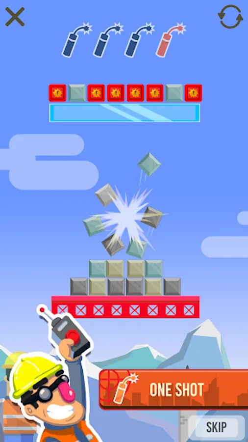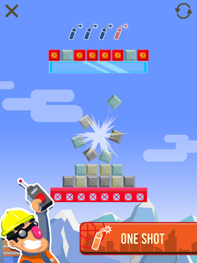 Hold your finger to charge the explosion, release it to ignite the blast, burst all the obstacles and clear the platforms. Your explosions can go from poof to kaboom, use just the exact force to clear the stages with 3 stars, your remaining explosions are the dynamite icons above.