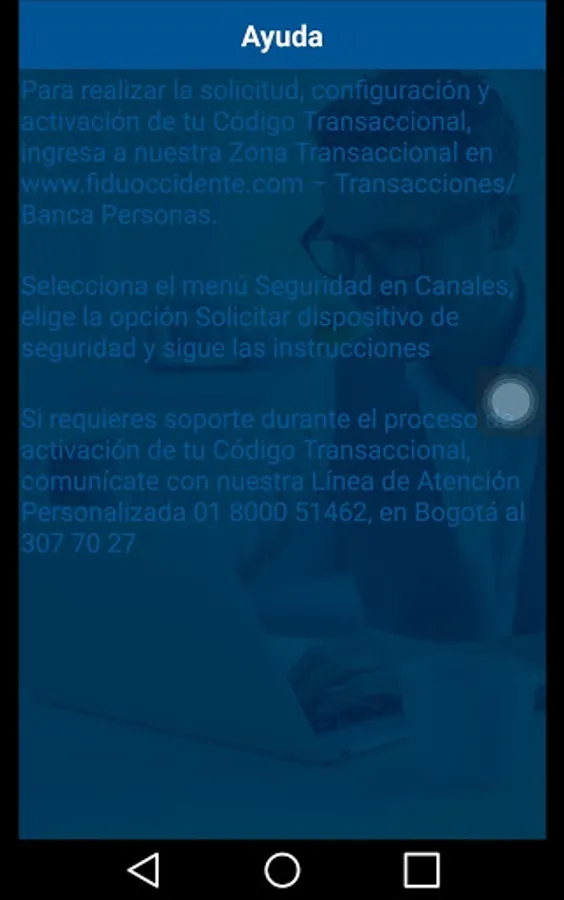 Thinking about the security of their transactions, Fiduoccidente offers its clients strong authentication devices, (Transactional Signature - FIDUOCCIDENTE APP), which allows them to access our web services for transactions and / or consultations, complying with the standards and best international practices in the matter. of security.