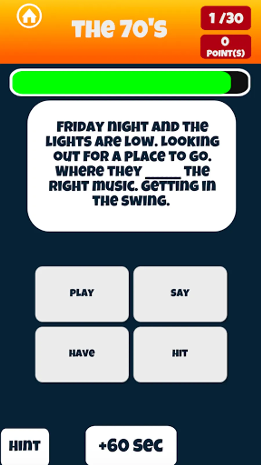Do you know your lyrics? Take the test and see how many song lines you can complete correctly in 60 seconds. Challenge your friends and see who's the boss. Music from the 70's to present. Having a little trouble? No problem! You can always click the help buttons at the bottom for hint and extended time.