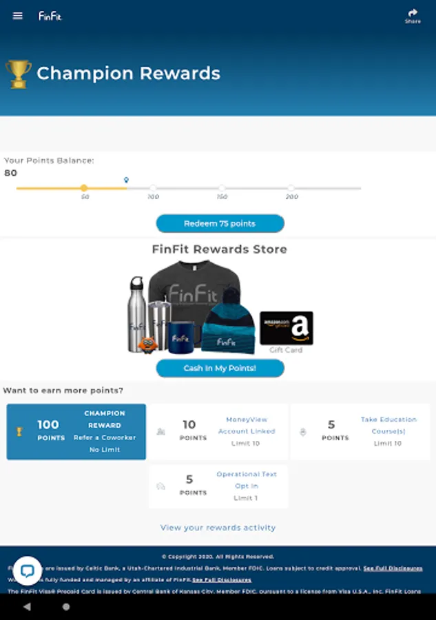 FinFit offers a wide range of educational resources, tools and financial solutions to assist employees in meeting their financial goals and achieving financial stability. Through the FinFit member rewards program, you’ll earn points that you can redeem for cash and prizes. Here are some of the financial services available: