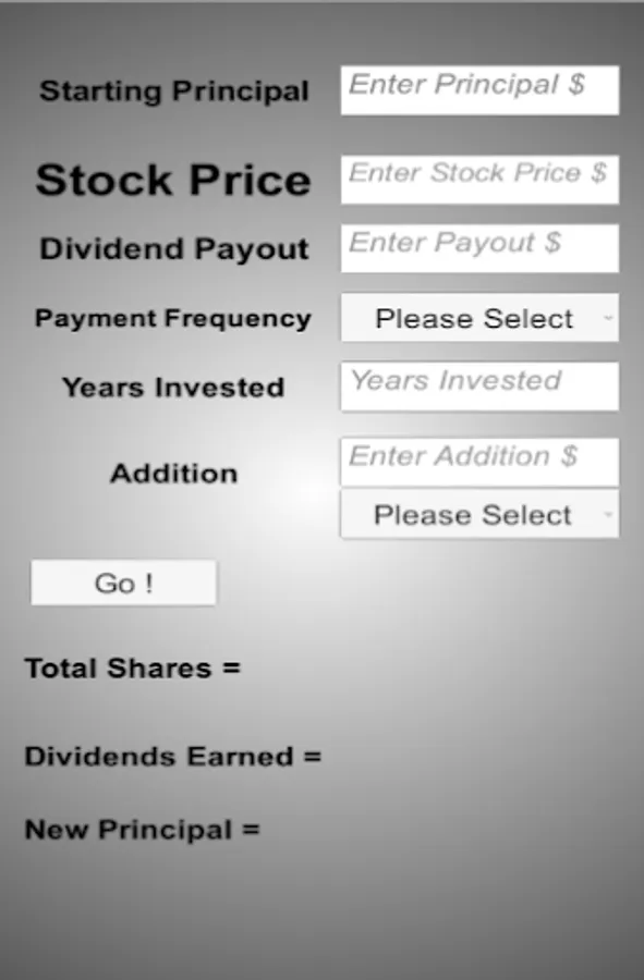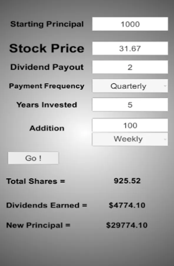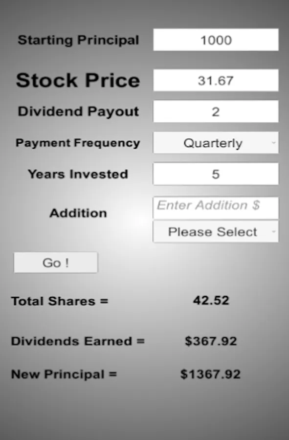 Enter Your Starting Principal, Stock Price & Annual Payout.