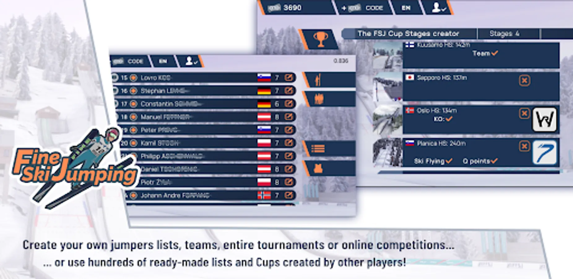 - Custom Tournaments, World Cup, Rw Air, 4H (with KO system), Flying World Championship, Planica7, Willingen6, T-N5