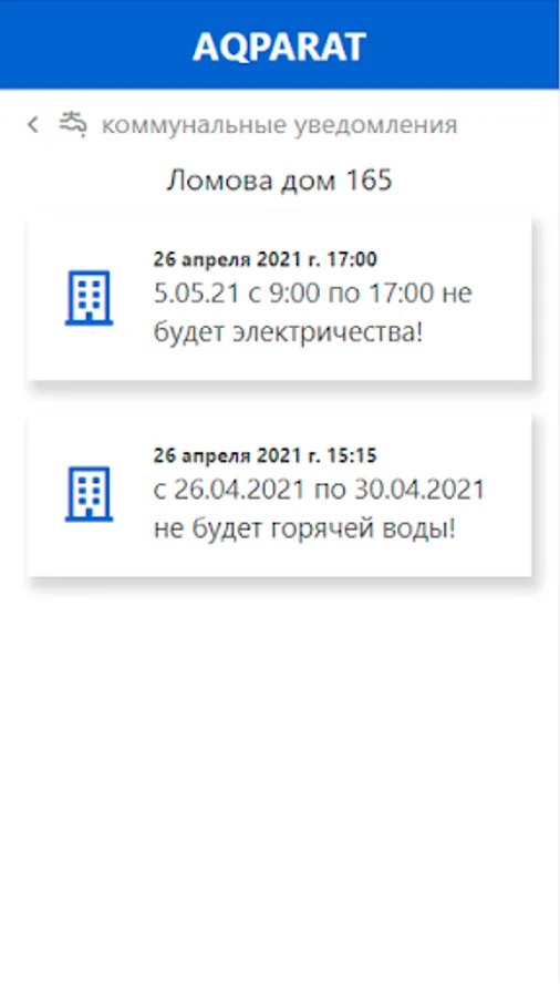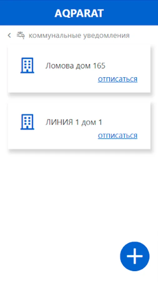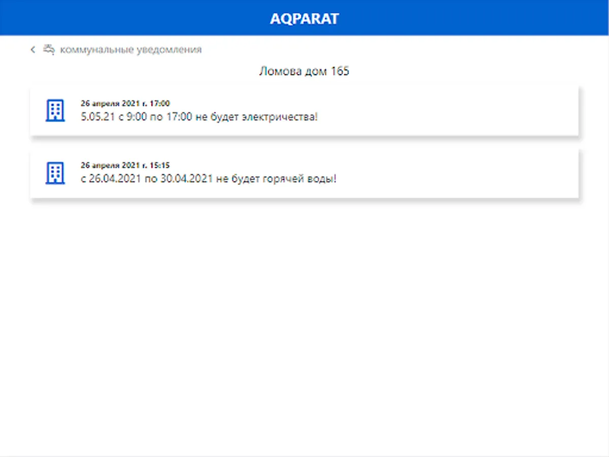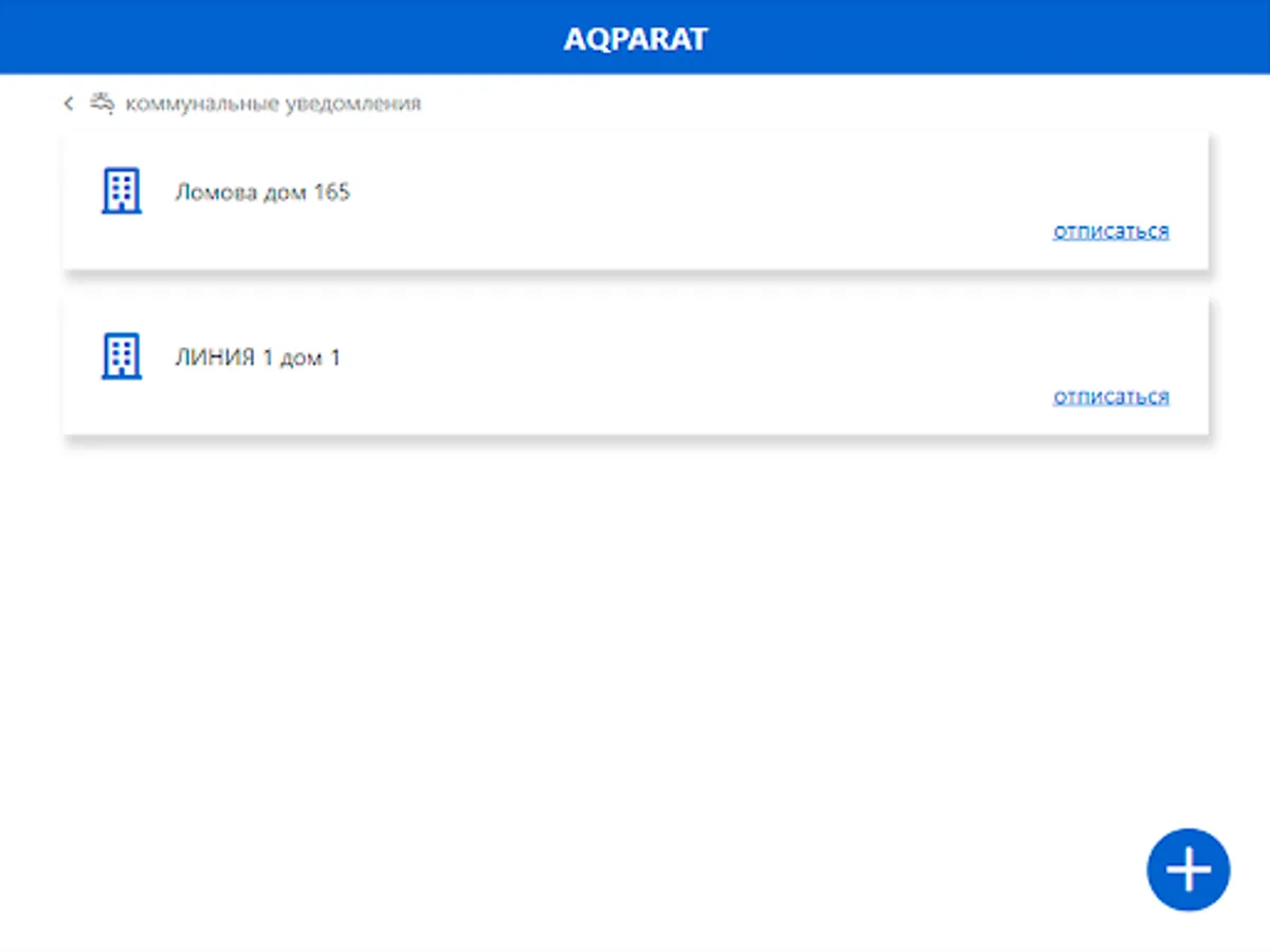 Time to launch the application on the "Smart City" principle. In Aqparat, you can subscribe to any houses in your city and receive information about their utilities. Subscribe to your home, the home of your parents and loved ones, and you will always have up-to-date information about the state of not the entire city, but those places that are important to you!