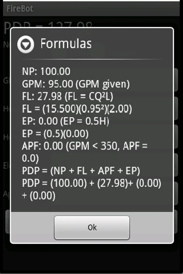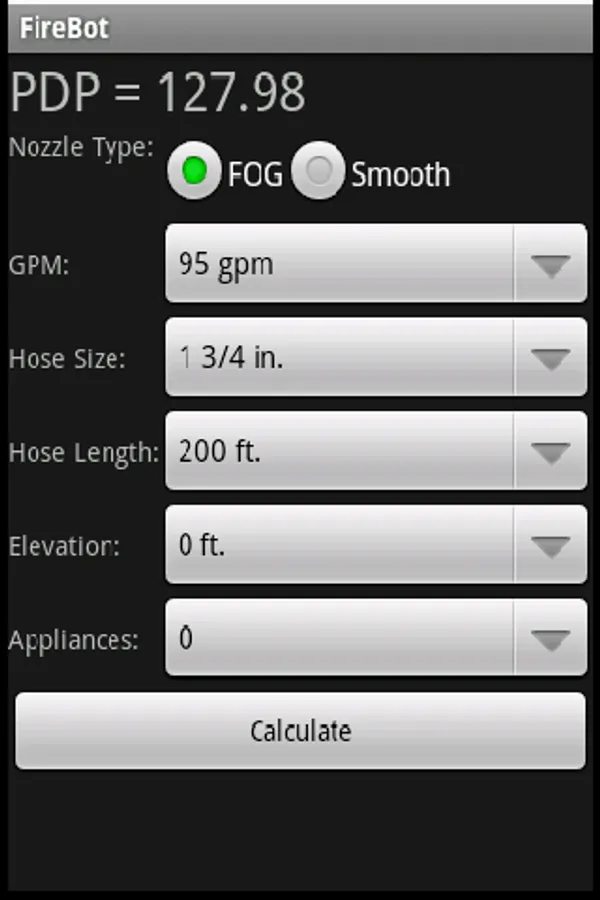 Firebot is a fire fighter pump calculator that assists a fire apparatus operator (FAO) in determining the pump discharge pressure (PDP) in fire engines. The combination of friction loss and change in elevation is the pump discharge pressure.
