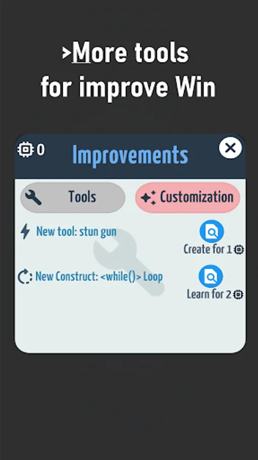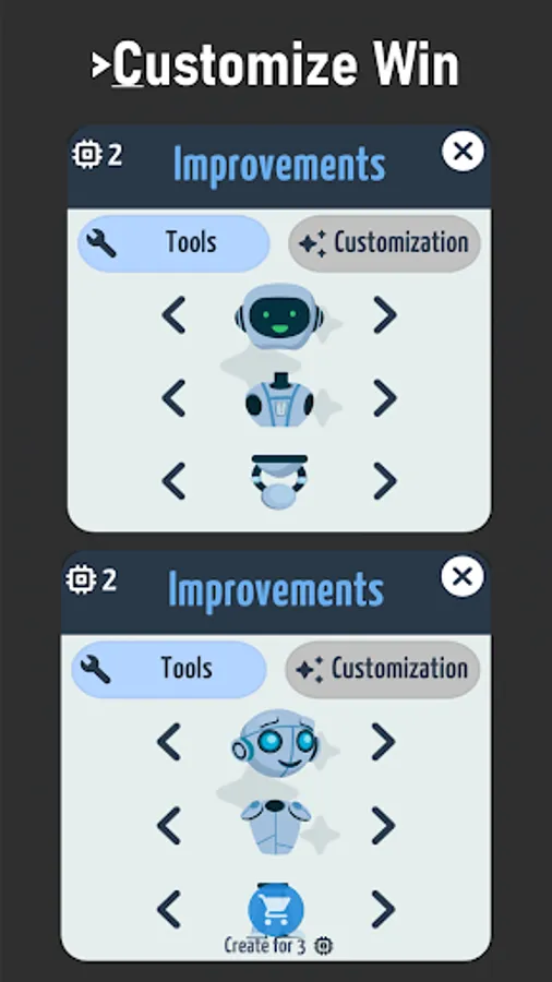 As you progress through the levels, the player will meet microchips on the map, collecting which can be used to study tools or customize the robot. At the moment, there are 2 improvements in the "Improvements" panel: the attack command and the "while" construction, which will be useful for completing levels, and when exactly - Win will tell the player at the appropriate level. To customize the robot, there are 9 parts in total, 3 parts for the head, torso and legs.