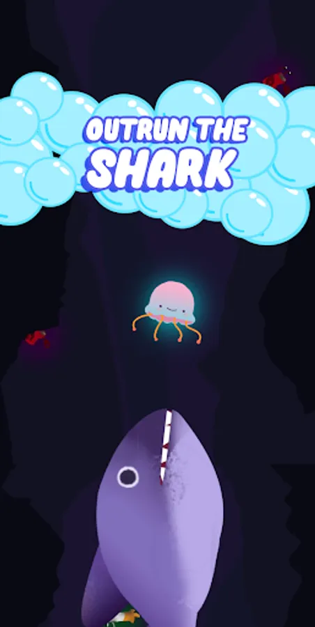 Our Jellyfish friend is very hungry thus it went for a swam to eat its favorite food, “fish eggs” as it swims suddenly a big menacing shark tails our little friend to catch up our little jellyfish. The jellyfish swims very fast trying to out run the shark but be careful of the hazards in the way because they tend to slow our little jellyfish friend