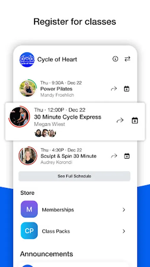 Book your next spin class at Cycle of Heart from the convenience of your phone. Check the class schedule, invite a friend to class, and more!